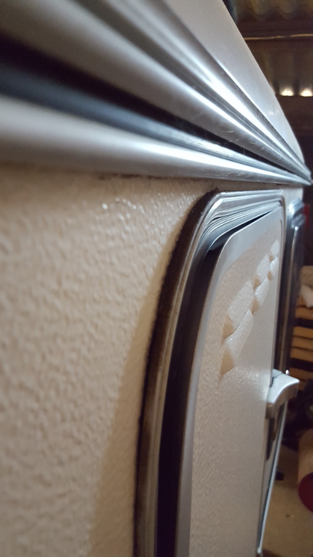 Bonjour, sauf erreur de ma part, il semblerait que la partie supérieure du bâti,côté gauche vu de dehors, soit voilée et en porte à faut sur la carrosserie. Essaies de vérifier la planeité avec une règle de maçonnerie ou un grand niveau. Regardes aussi si une des 2 paumelles n'est pas sortie de son logement, elles sont juste emboîtées comme sur une porte lambda.