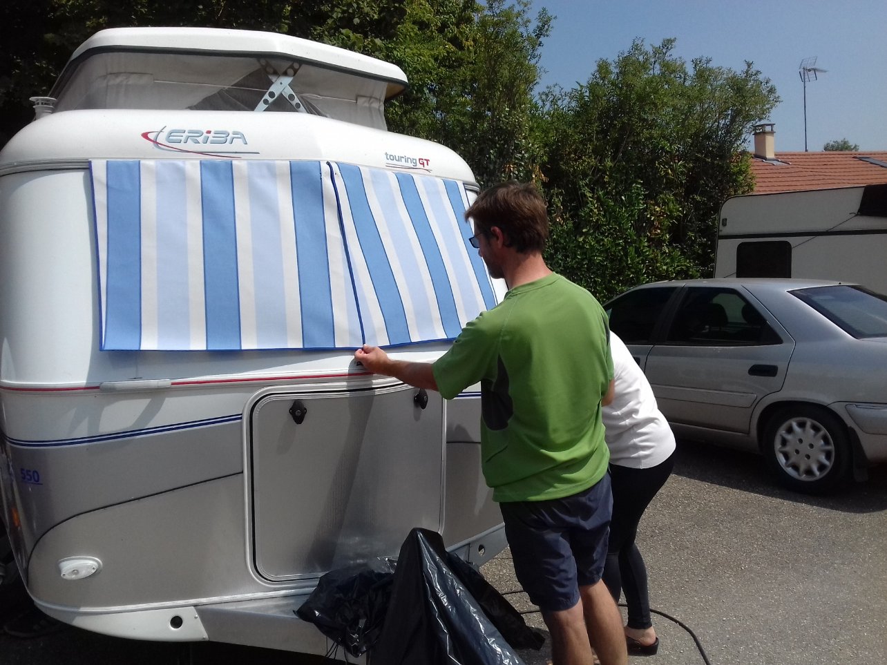 En attendant voici 2 photos de notre attelage et de mes rideaux pare soleil avant dont je suis particulièrement fier réalisés avec ma tante couturière !