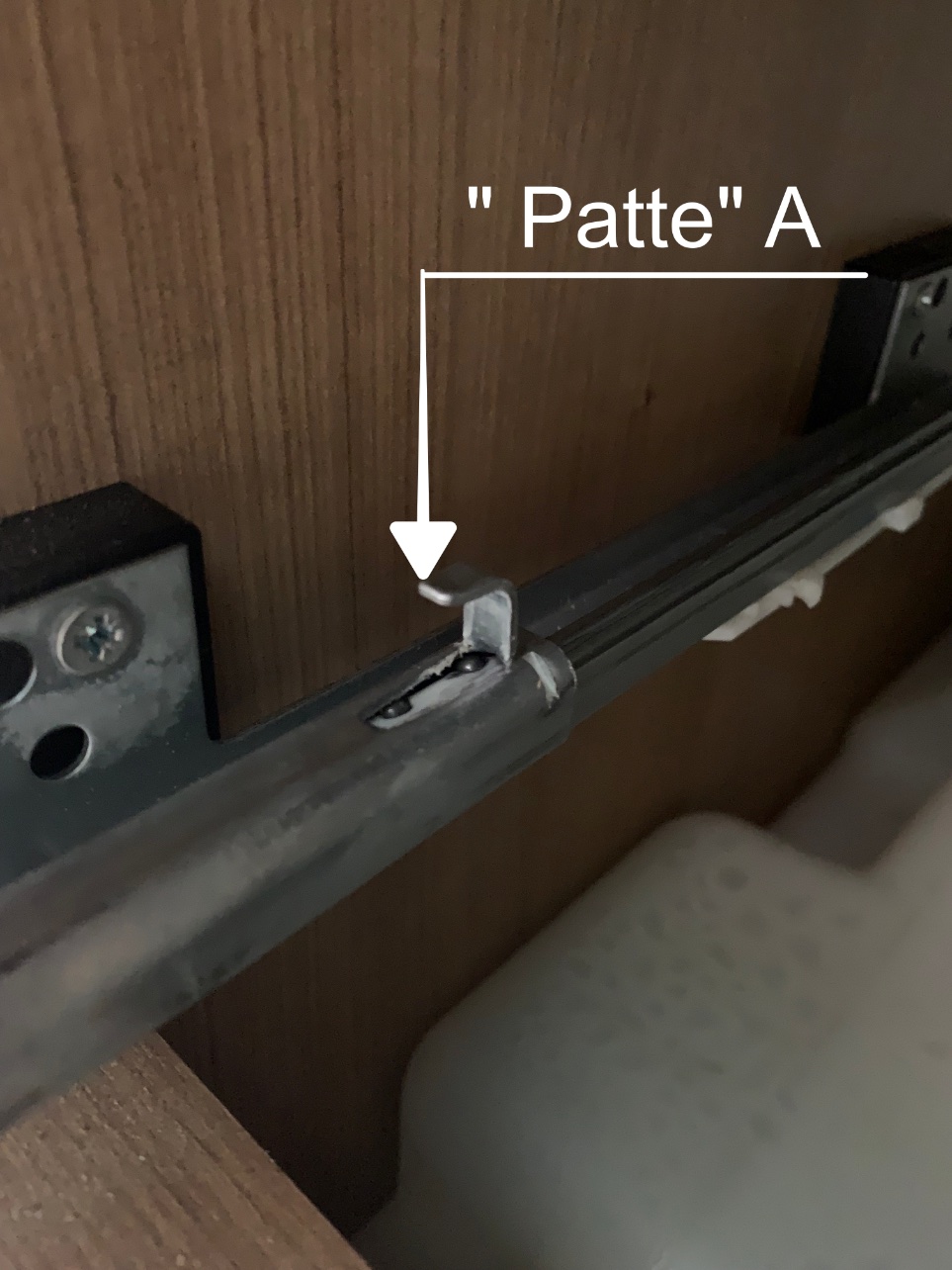 la patte « A » rentre dans le logement « B ». Maintient du tiroir seulement par le pincement de la patte A , franchement c’est pas terrible. Avec le temps il est évident que la patte perd de sa pression ... et ne retient plus le tiroir.
