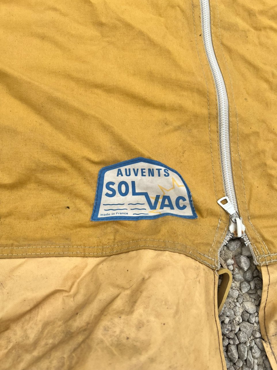 Il y a un sac inscrit "Rigipli", un autre avec "Puck sable", et sur l'auvent "Solvac".