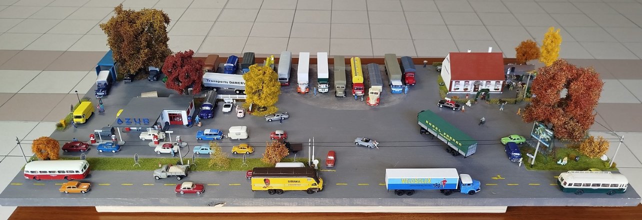 Bonjour, je vous présente mon diorama représentant la vie des routiers durant les années 60. Nous sommes en Octobre 1968 et c'est une belle journée ensoleillé au bord de la RN6 sur laquelle se croisent automobilistes et routiers. Vous y découvrirais les mythiques camions qui sillonnés les routes françaises à cette époque (Berliet, Willème, Unic, Bernard etc…) et bien sur un voyageur qui tracte une Eriba ! . Arrêt déjeuner a l'auberge, avec une authentique station AZUR. Mon diorama mesure : 57 x 120 cm.