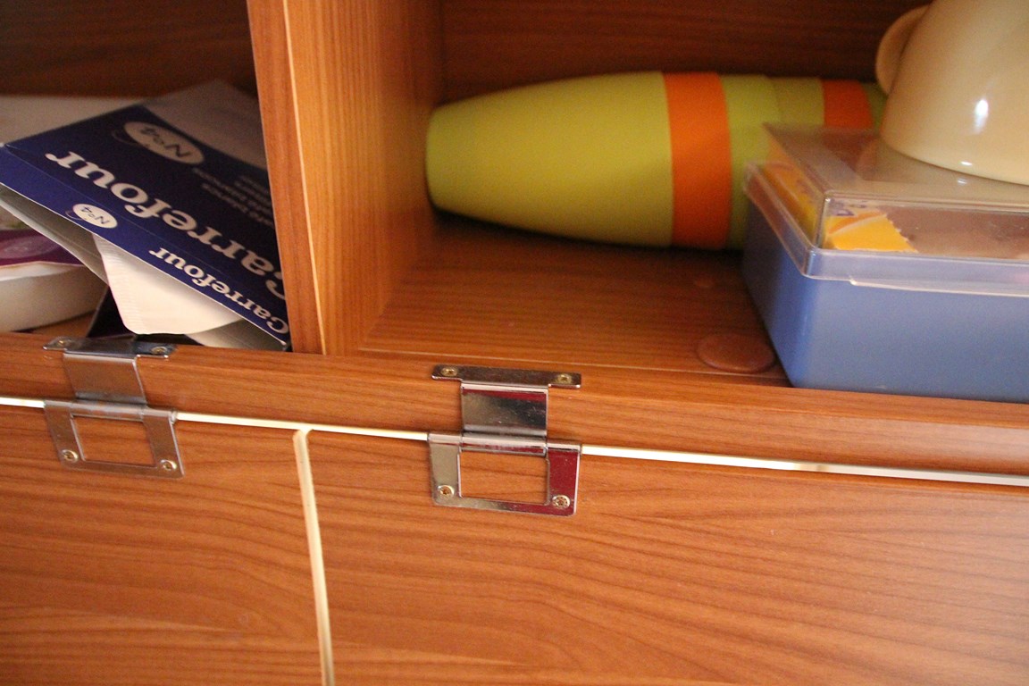 J'ai mis sur le plancher (entre frigo et placard) une butée de porte arrondie pour la porte de la salle de bain (elle ne gène pas trop sur le sol, étant à l'aplomb de l’extrémité de la porte et proche du bord des placards), cela évite de forcer sur les charnières de cette porte.