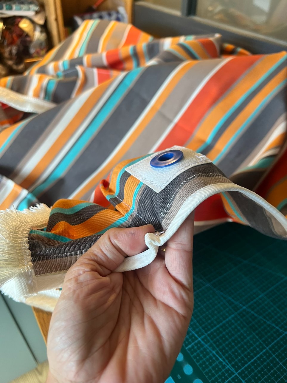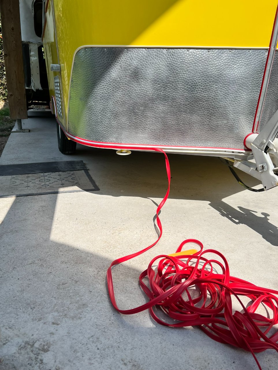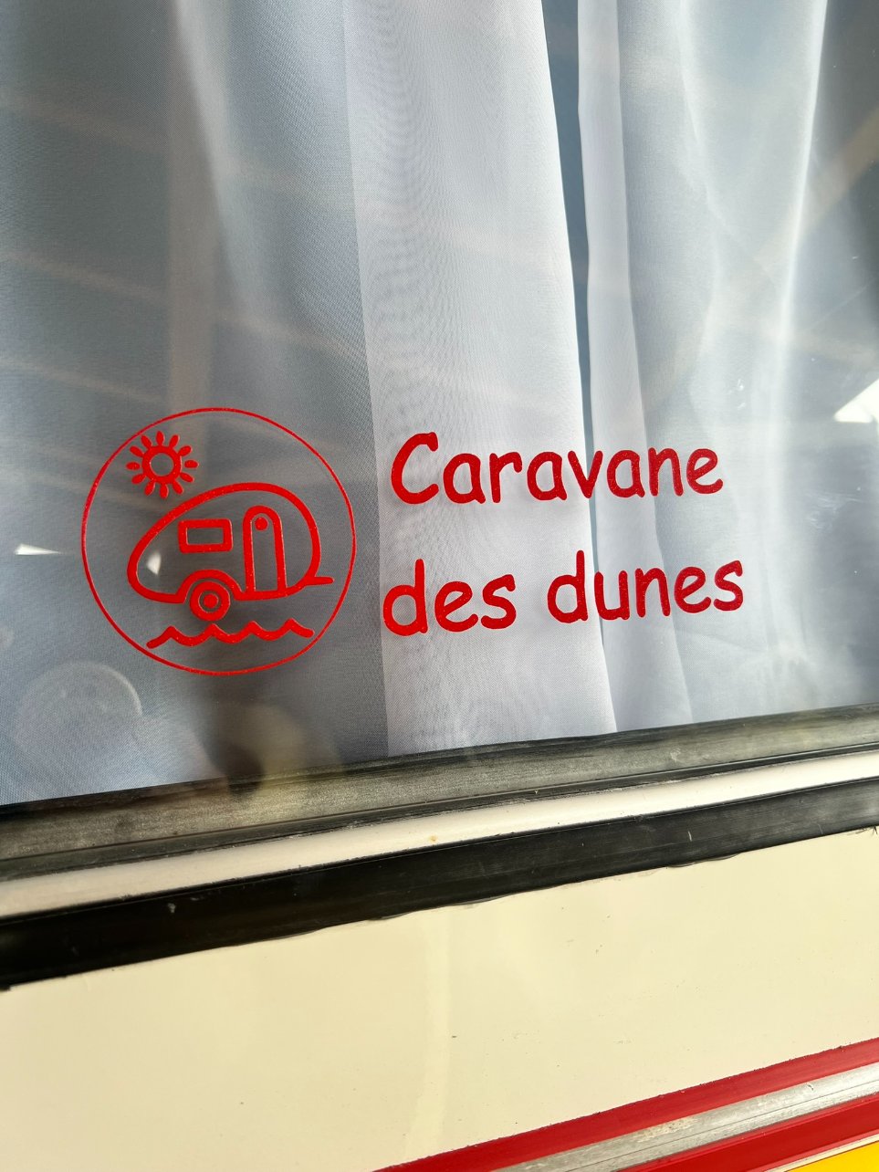Dans le principe un toile rectangulaire, du biais en tissu extérieur sur les côtés (le blanc), au niveau de la caravane un jonc acheté chez... (je vous dirai si vous voulez) un peu de simili cuir blanc (recyclage ciel de toit) pour faire des renforts d'œillets et forcement parce que Mamie est coquette, une petite frange sur le devant cousue sur le biais! Premier test, j'arrive pas bien à tendre car je manque de place dans le jardin mais sur le principe ça devrait ressembler à ça... Et puis fifille a décidé de faire des coquetteries, petit vinyle rouge à paillettes sur la vitre arrière avec mon petit logo Instagram (mamie est dans le vent, elle est sur les réseaux