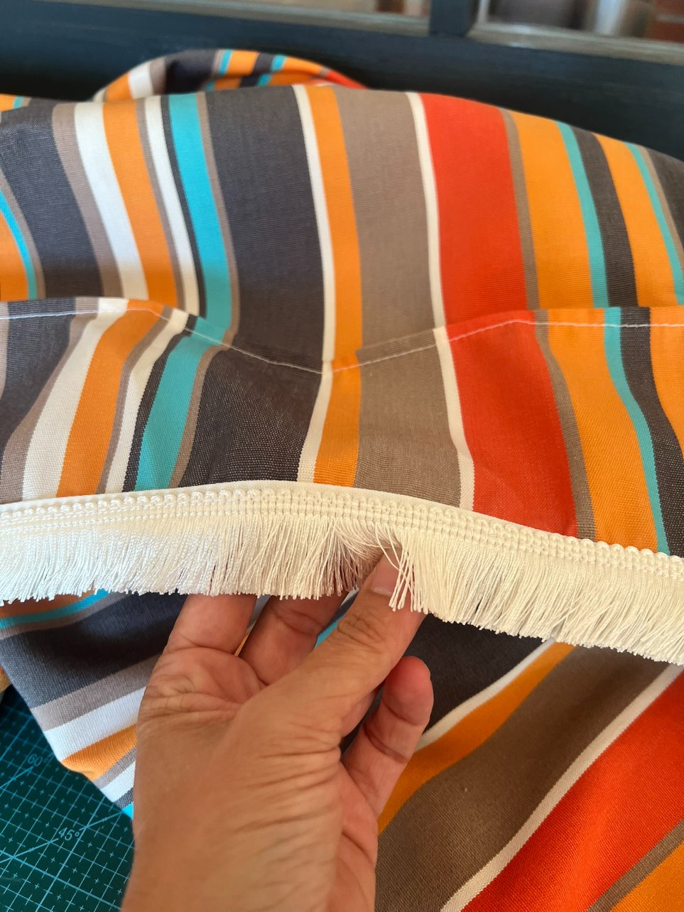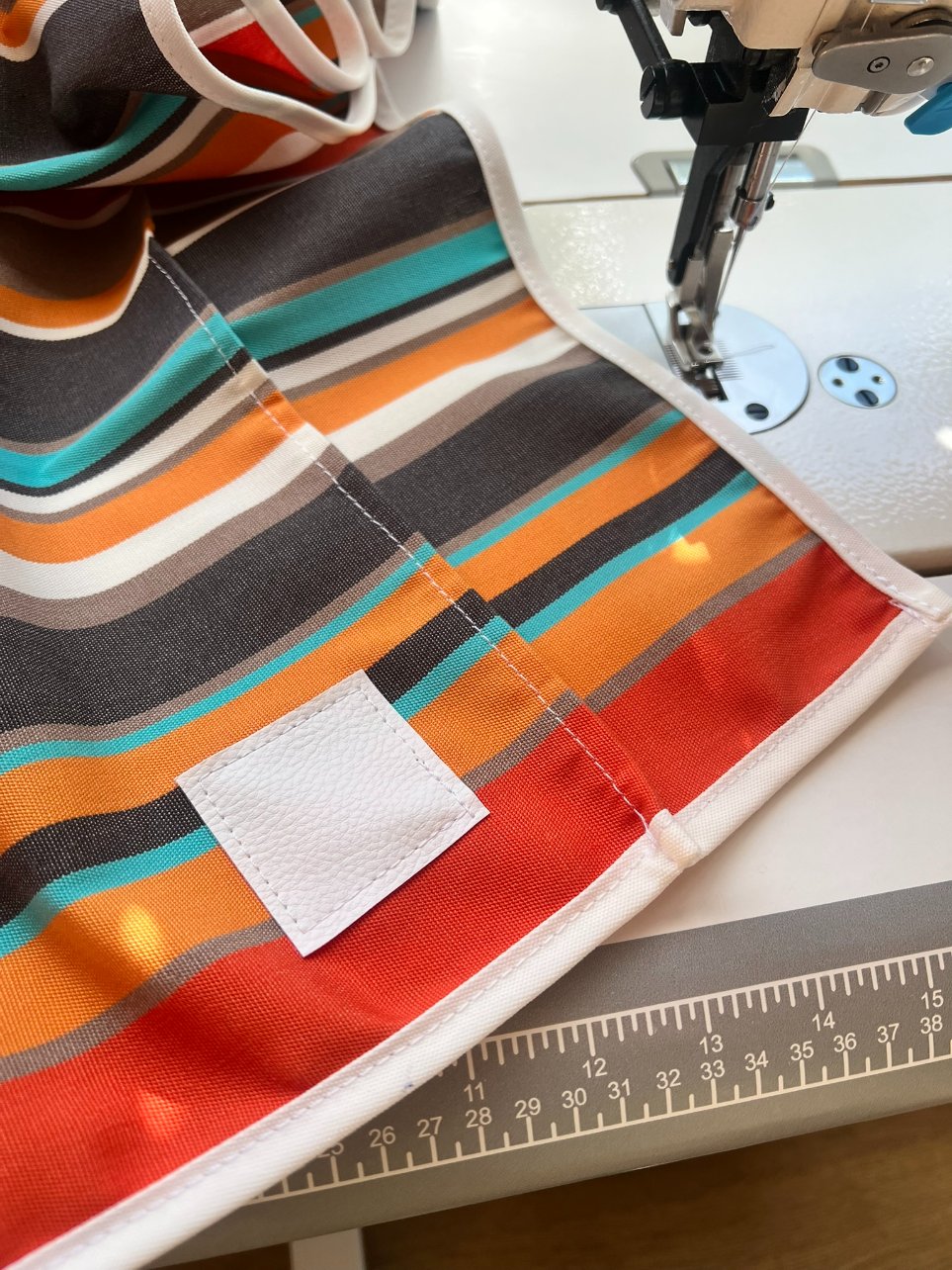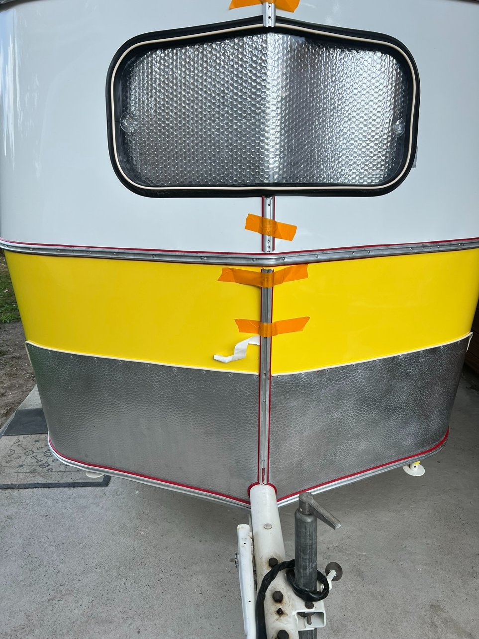 Dans le principe un toile rectangulaire, du biais en tissu extérieur sur les côtés (le blanc), au niveau de la caravane un jonc acheté chez... (je vous dirai si vous voulez) un peu de simili cuir blanc (recyclage ciel de toit) pour faire des renforts d'œillets et forcement parce que Mamie est coquette, une petite frange sur le devant cousue sur le biais! Premier test, j'arrive pas bien à tendre car je manque de place dans le jardin mais sur le principe ça devrait ressembler à ça... Et puis fifille a décidé de faire des coquetteries, petit vinyle rouge à paillettes sur la vitre arrière avec mon petit logo Instagram (mamie est dans le vent, elle est sur les réseaux