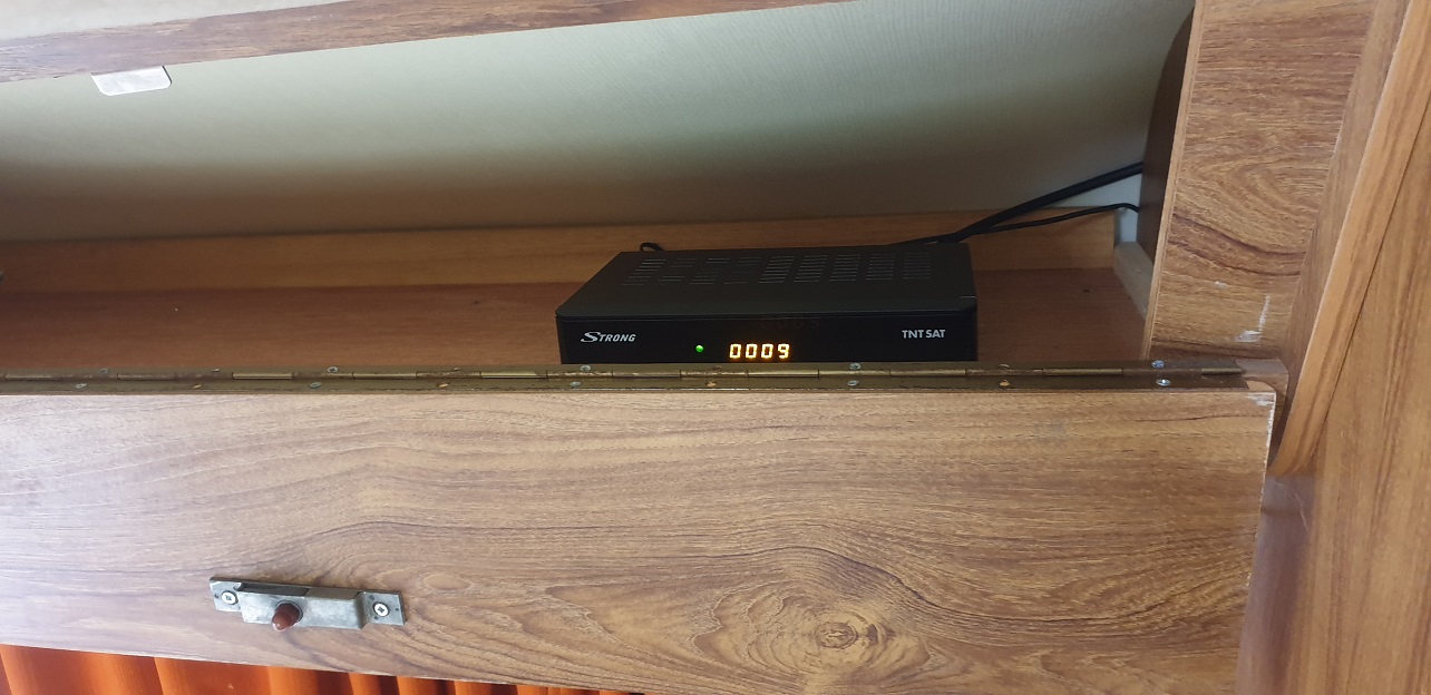 Hier je me suis penché sur l'installation et l'alimentation de mon décodeur satellite. Normalement il est alimenté par un transformateur qui délivre 12V et 1.5A maximum. J'ai donc récupéré une prise identique à l'alimentation d'origine. Après avoir rallongé le fil je l'ai branché sur l'alimentation des pompes à eau, la ligne c'est du 1.5 mm² elle devrait sans problème pourvoir alimenter deux pompes à eau et le décodeur je pense. J'ai fini par coller au double face le décodeur dans un des placards haut.