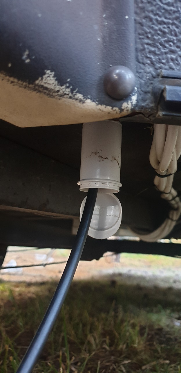 Ensuite la câble entre la parabole et le décodeur sort désormais à l'extérieur sans passer par le champignon: La petite boite permet de ranger le connecteur F à l'abri.