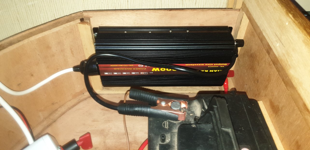 "Le seconde chose que j'ai faite c'est d'installer un convertisseur 12/220V. J'ai commandé un modèle pur sinus de 2000W sur Aliexpress: 78,09 €. Je n'ai pas besoin d'autant de puissance mais je préfère avoir de la marge. Je l'ai placé dans le tiroir à coté de la porte ou se trouve déjà les deux batteries:" Sic Julien