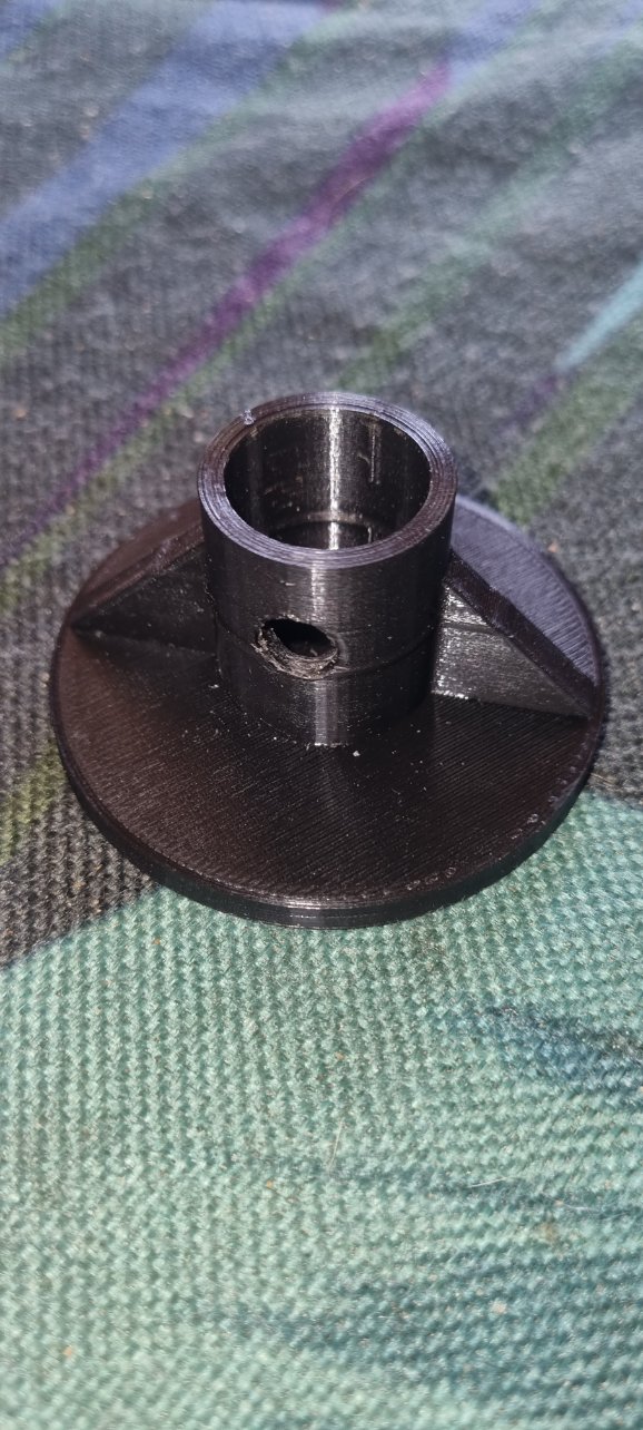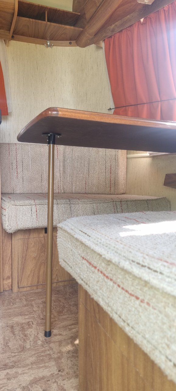 Une des modifications que j'ai effectuée, c'est le remplacement de la fixation du pied de la table de la dinette qui a cassé. Elle avait déjà était réparée par un ancien propriétaire. Possédant une imprimante 3D je l'ai donc modélisée et imprimée avec un remplissage à 100%: