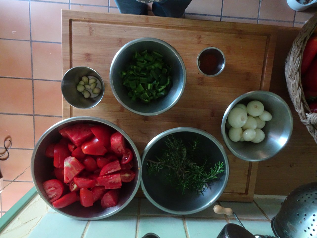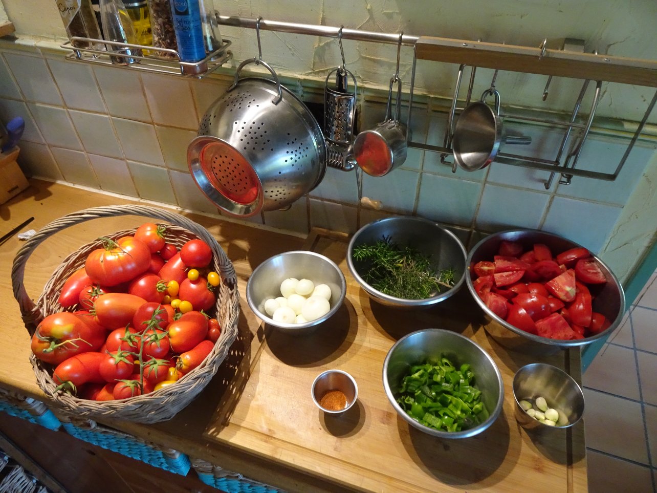 Ben aujourd'hui, c'est conserve de sauce basquaise au piment d'Espelette. Petit tour au jardin pour récolter les tomates et les poivrons. Pour les oignons,l'ail et la poudre d'Espelette c'est déjà fait.