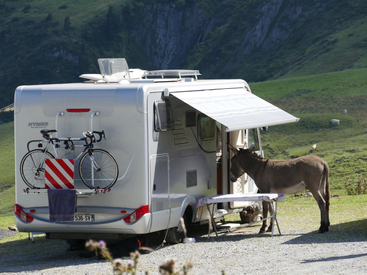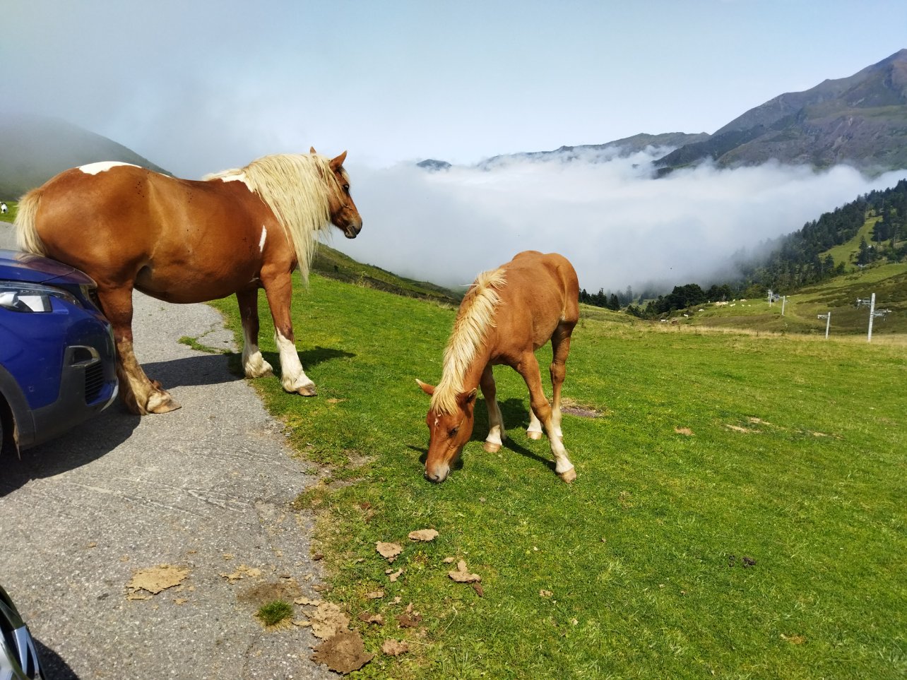 Si il y en a qui rencontre des chevreuils, d'autres rencontrent des chevaux qui ont besoin de repos du fessier !!! Ce n'est pas ma voiture, le proprio va s'en souvenir, le capot à fait ch'glong!!! Parking du Hautacam ..
