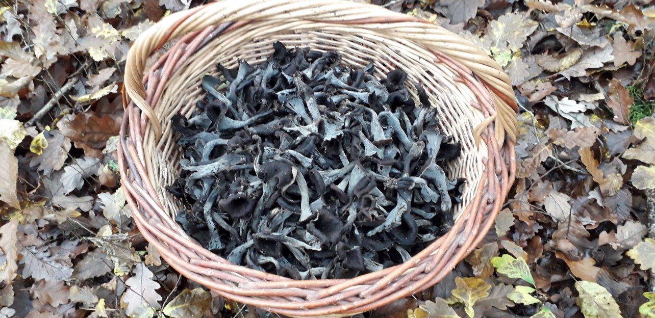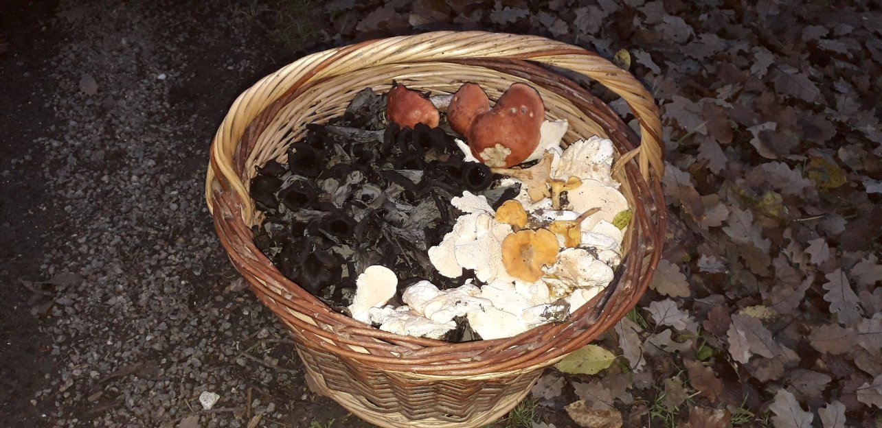 5 kg de champignons, en majorité trompettes des morts, cèpes, pieds de moutons et quelques girolles.