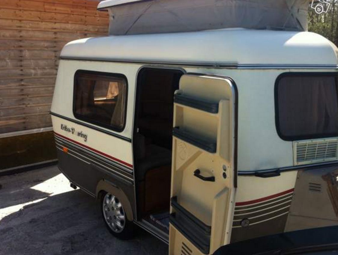 eriba puck moin de 500 k avec auvent 2 place wc chimique tres bon état tractée par un trike tout équipée frigo gaz évier collection equipée 12v 220v