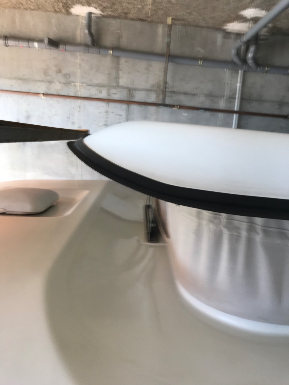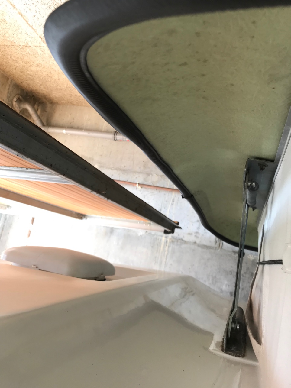 J'ai noté que le joint n'est pas fixé par de la colle. Son aspect ne présentant pas de signes de détérioration, je vais le conserver tel quel et ne le remplacerai que s'il se dégradait. Bien sûr je surveillerai sa propreté afin qu'il ne se recolle pas au toit, ce qui avait provoqué son "dessertissage".