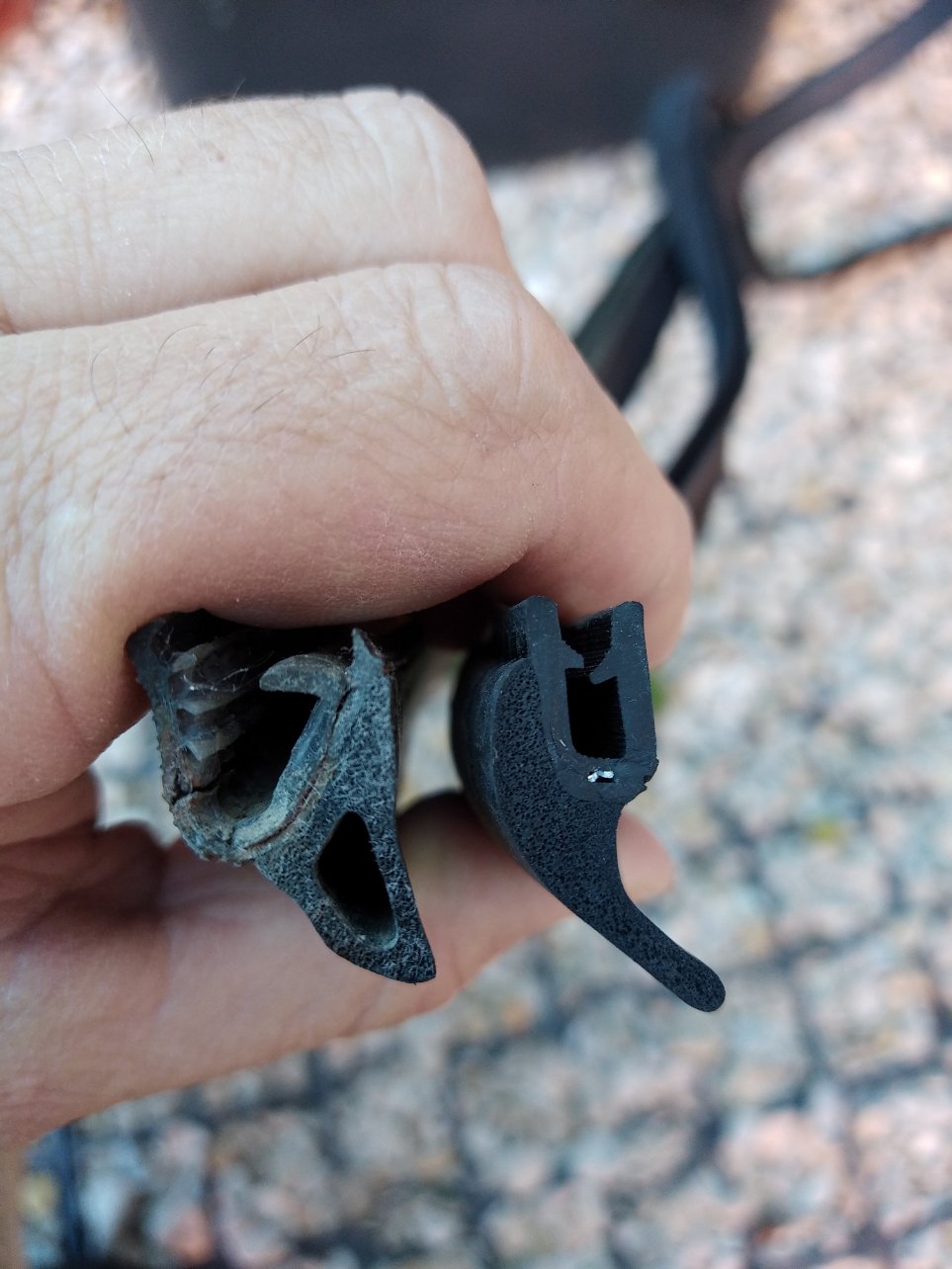Le joint actuel me semble peu adapté, sans doute changé en cours de route, car le profil rond est à coté de la partie en "U" qui se clipe sur le toit, et elle est de plus pourvue d'une mini lèvre qui est dirigée... vers le haut !
