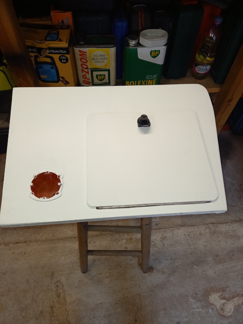 Ponçage et cet après midi après démontage de la charnière et du coffre mise en peinture