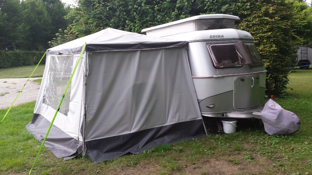 Après plus d'un an de réflexion nous avons investi dans un auvent Clairval TwinAir pour notre Triton ; notre ancien auvent Clairval en forme de pointe de diamant est donc disponible ; il est en bon état, aucune déchirure, simplement un ressort à changer entre 2 tubes, je n'ai plus non plus les magnifiques haubans donnés à mon fis pour le dépanner un soir de tramontane ; en revanche je laisserai un système que j'avais bricolé pour éviter les poches d'eau ; si l'un(e) d'entre vous est intéressé je souhaiterais en tirer 150 € pour financer le remplacement de quelques bricoles sur notre cagouille. J'ai joint 3 photos de son dernier montage en juin dans le Jura.