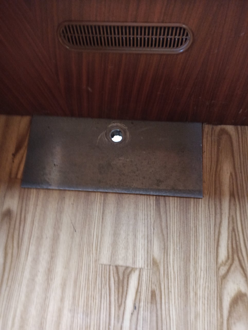 Peut-être que les experts sauront, mais moi je sèche. On voit des marques circulaires sur la platine en métal qui indiquent que quelque chose reposait ou était serré sur ce trou... Un système de fixation de la roue de secours ?