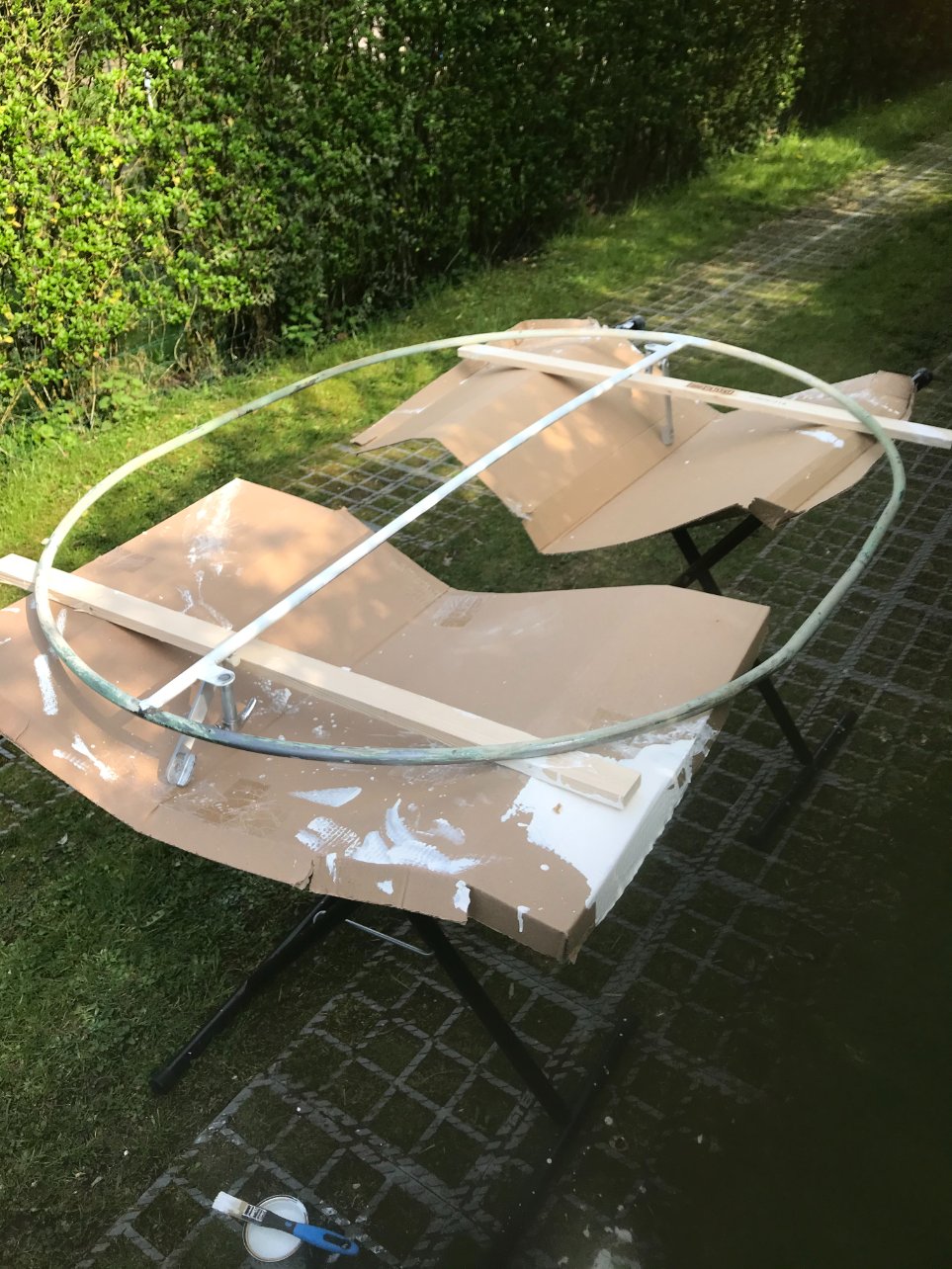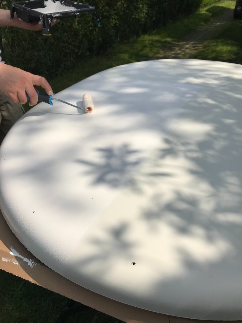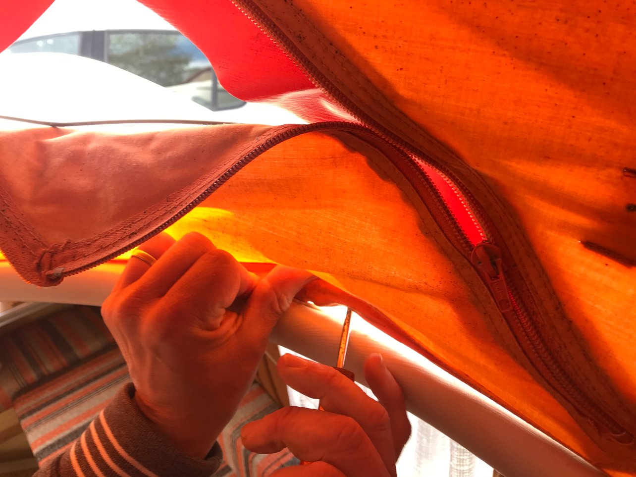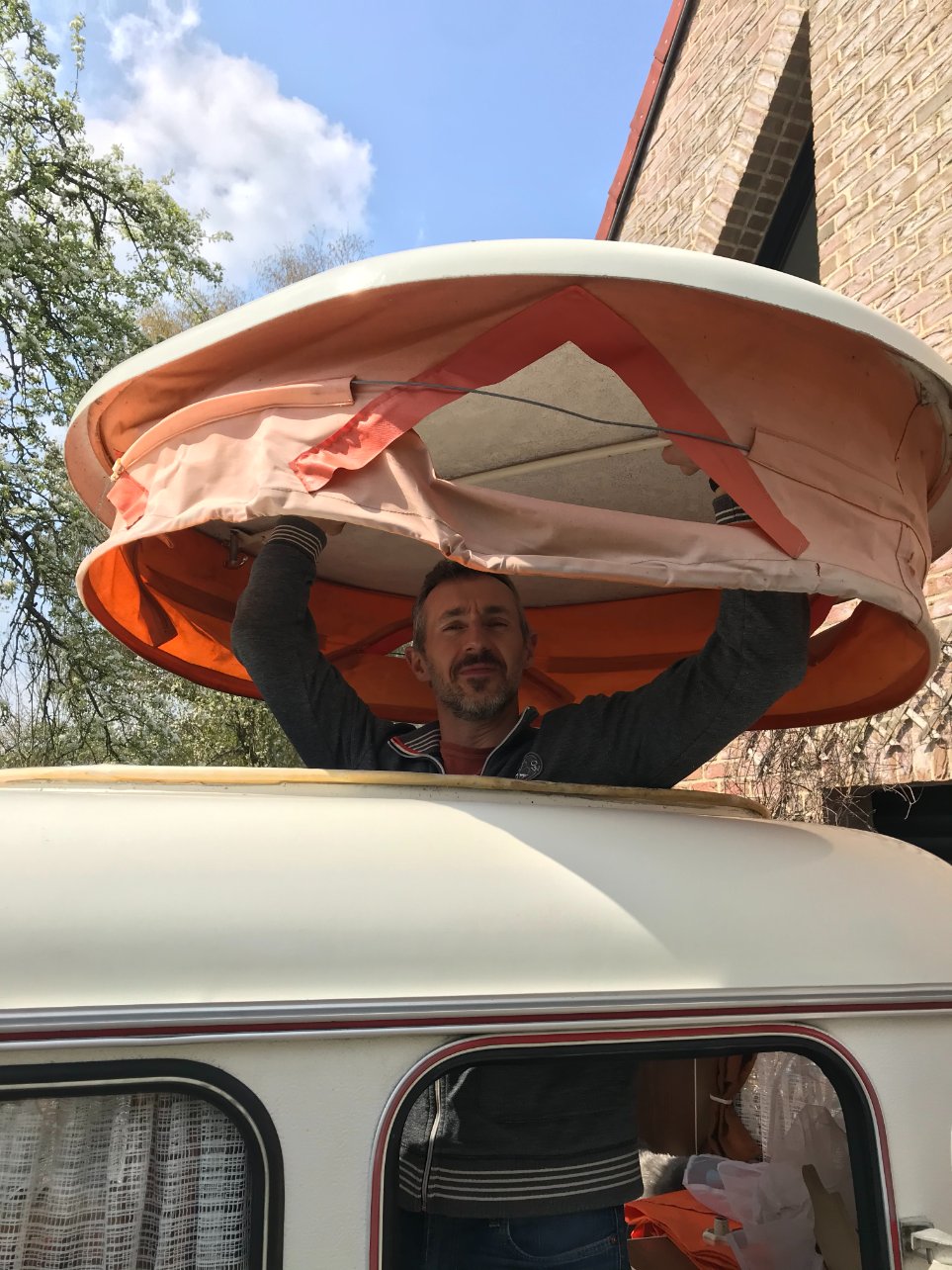 C'est parti pour le changement de toile du champignon et la peinture du toit!