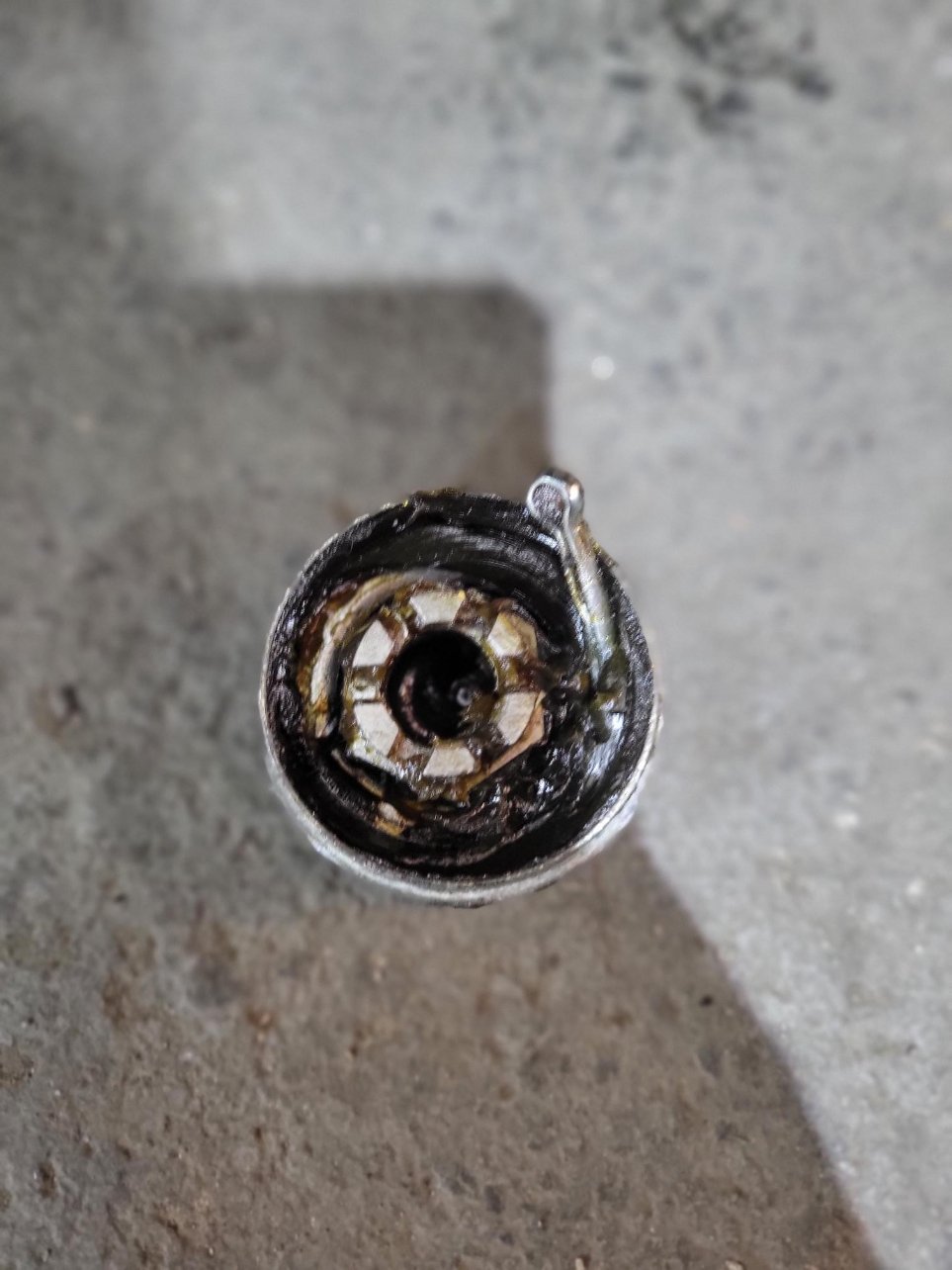 Le trou qui permet de voir l'état d'usure de la garniture : flèche bleue