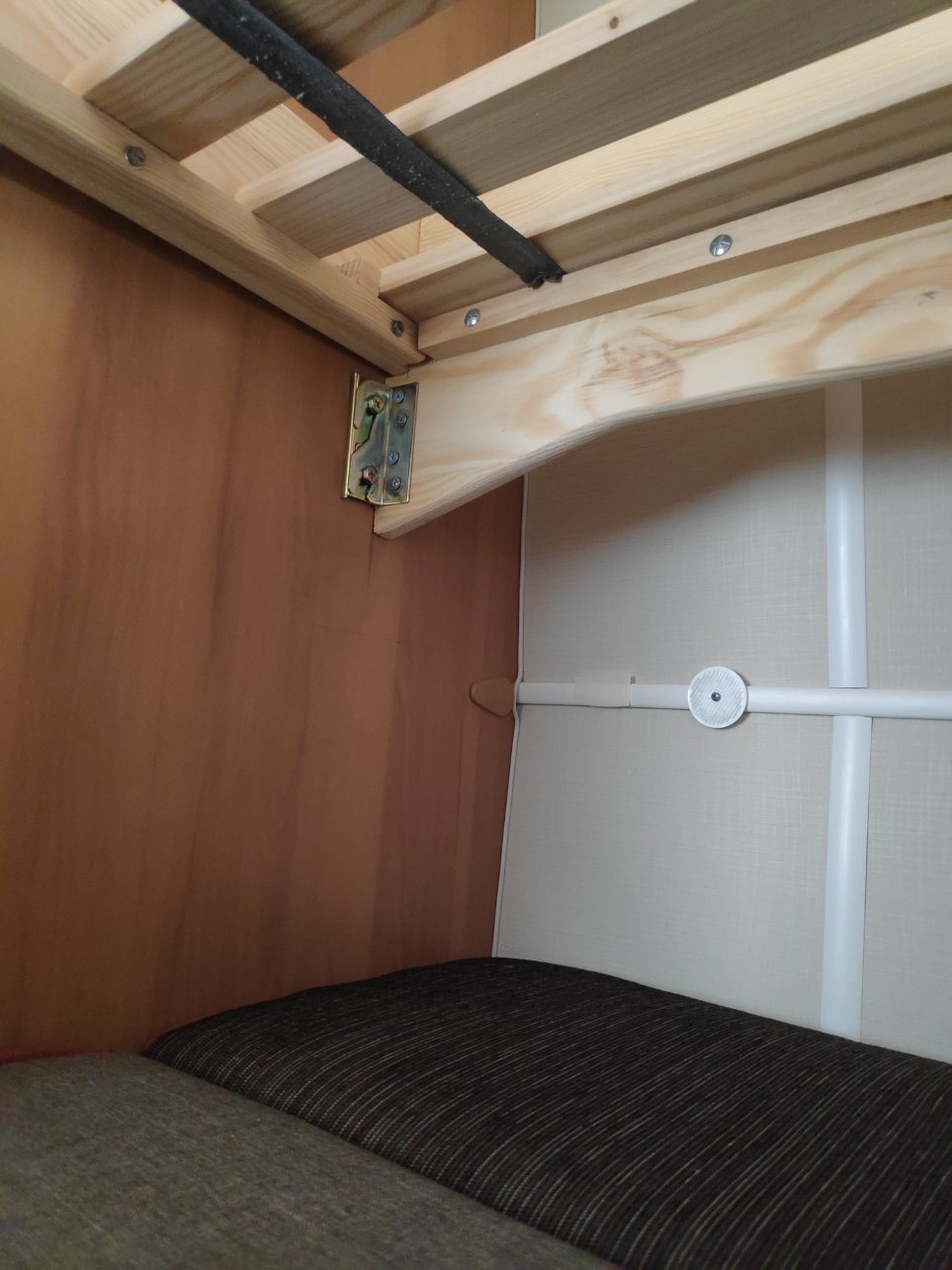Je n’ai pas éprouvé le lit mais vu les matériaux utilisés je pense que le point le plus faible est le support fixé sur la paroi du WC et comme il est fixé par 4 vis de part en part de cette dernière la charge de rupture doit être bien supérieur au poids d’une personne de moins 1,60 m. Pour les 3 autres points on appuie sur le champ des planches donc là aucun risques de lâcher.