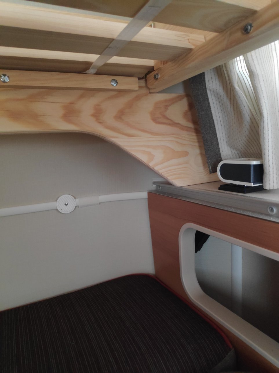 Il s'installe en moins de 5 mn (6 vis à desserrer et deux Grenouillères à levier), un seul point de fixation à la caravane les trois autres points sont seulement en appuis sur cette dernière. Il est composé de 6 pièces : les 4 côtés, un sommier à lattes enroulable et une mousse pour le matelas non reçue à ce jour.