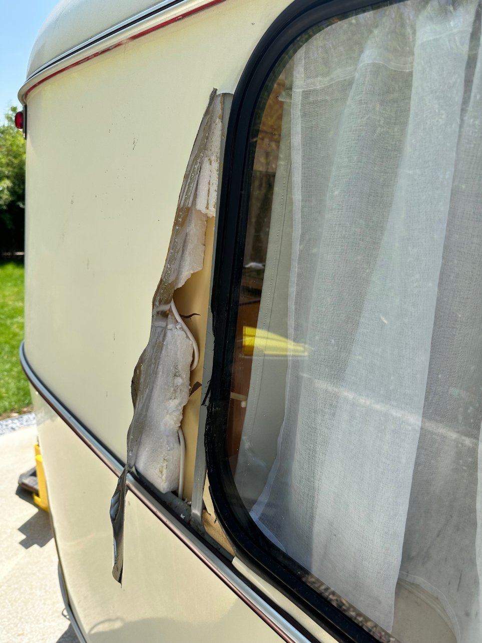 Le joint de baie a été découpé par les affreux, mais le joint étant tout sec ils n'ont pas réussi à enlever la vitre et s'en s'ont pris à la carrosserie