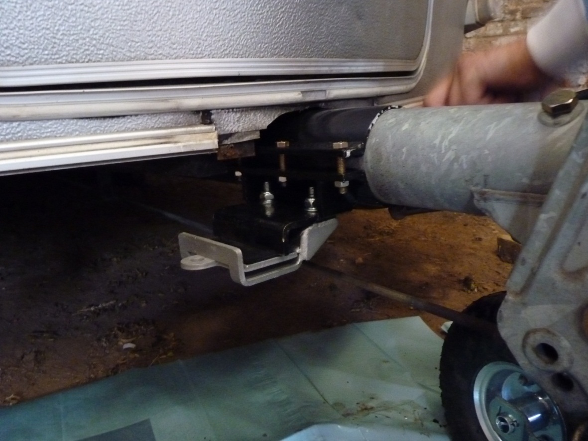 Dernière solution : utiliser le système prévu pour les Eriba série 500, sortie après 2006 = triangle placé sous la cara légèrement derrière le coffre gaz. L'attache dépasse alors légèrement du coffre et sur le coté gauche