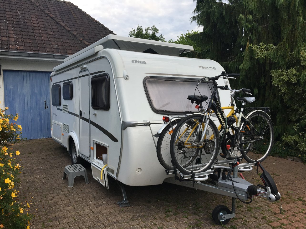 Content de retrouver quelques adeptes des Eriba Feeling, certes moins glamour que la gamme Touring, mais vraiment très confortable. ma 425 Feeling date de 2016, elle a déjà effectuée quelques tours de France, tractée avec un Scenic diesel de 150 CV avec 340 Nm de couple. elle est équipée d'un moover (derrière les roues ), d'eau chaude (mini cumulus), d'une petite trappe à l'avant sous banquette. J'ai enlevé la table d'origine pour une plus petite, moins lourde (nous ne sommes que 2), le PTAC a été réduit de 1400 à 1300 kg. un porte vélo à l'avant après avoir fait l'erreur d'avoir opté pour un porte vélo arrière (c'est beaucoup plus stable maintenant), j'ai remis aux normes actuelles l'installation gaz avec une bouteille Cube propane... pour cette année, j'ai commandé une mini clim Split à mettre sur la baie (525 euros) ..mais je ne l'ai pas encore reçue.