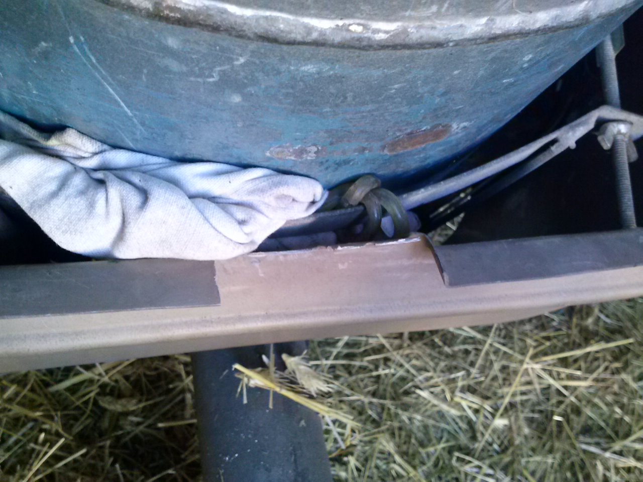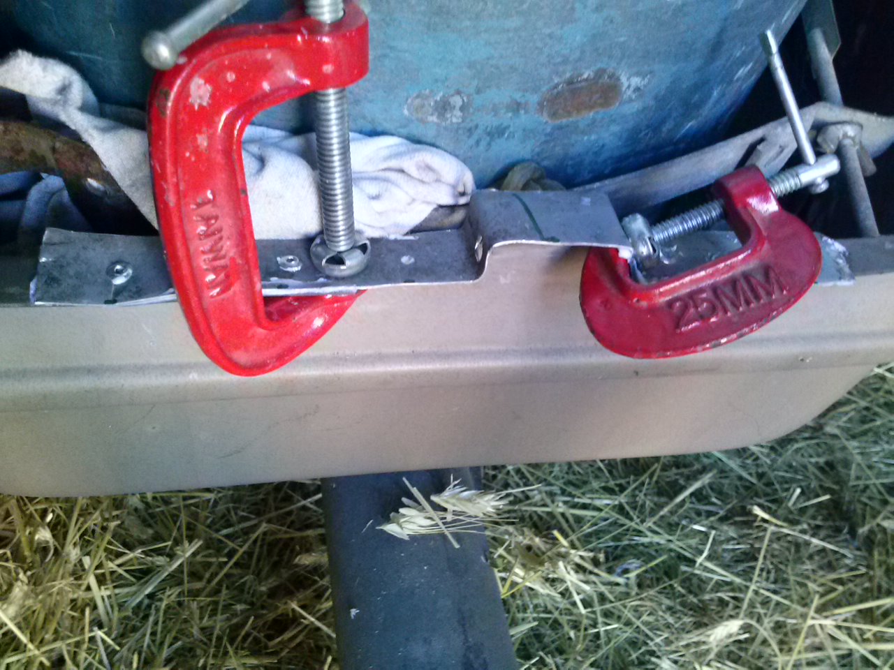 1° fixation d'un bout de métal plié (colle + rivets) 2° fibre de verre-résine pour faire joli et rigidifier l'ensemble J'en ai profité pour solidifier certains endroits fissurés