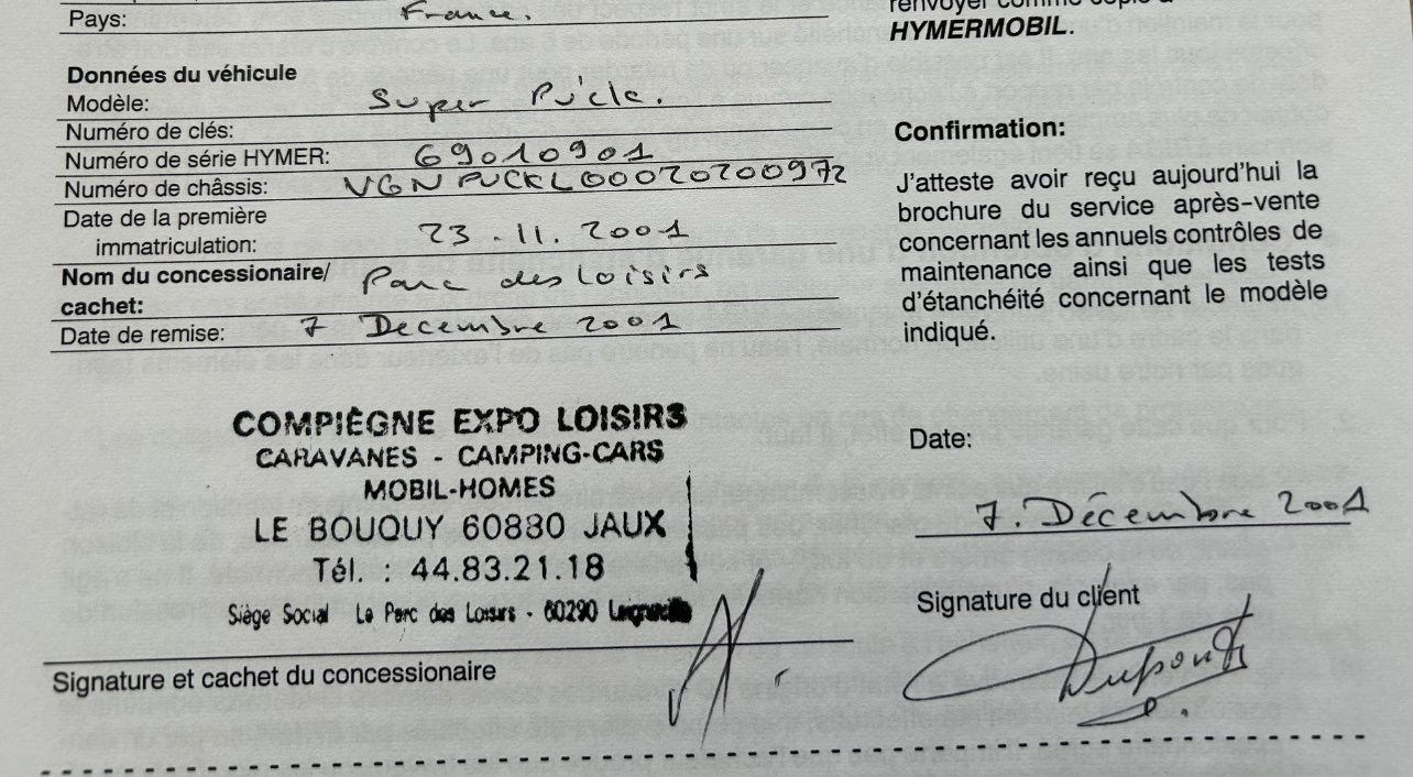 sur la carte grise j'ai en 1ere immatriculation : 23/11/2001 et sur la page "garantie" de la notice d'utilisation (photo) 7/12/2001,