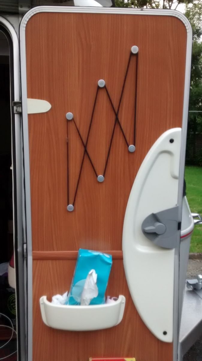 Dans les étagères de la porte, je mets : un rouleau de PQ, un rouleau d'essuie-tout, une boite de 100 mouchoirs papier, une boite de coton-tige, un flacon de shampoing, une lampe de poche, la corde à linge et ses pinces à linge, un sac poubelle de 20 l de rechange, un rouleau de tarlatane (adhésif large de 50 mm qui se découpe à la main)... : rien que des choses que le vent ne peut emporter.