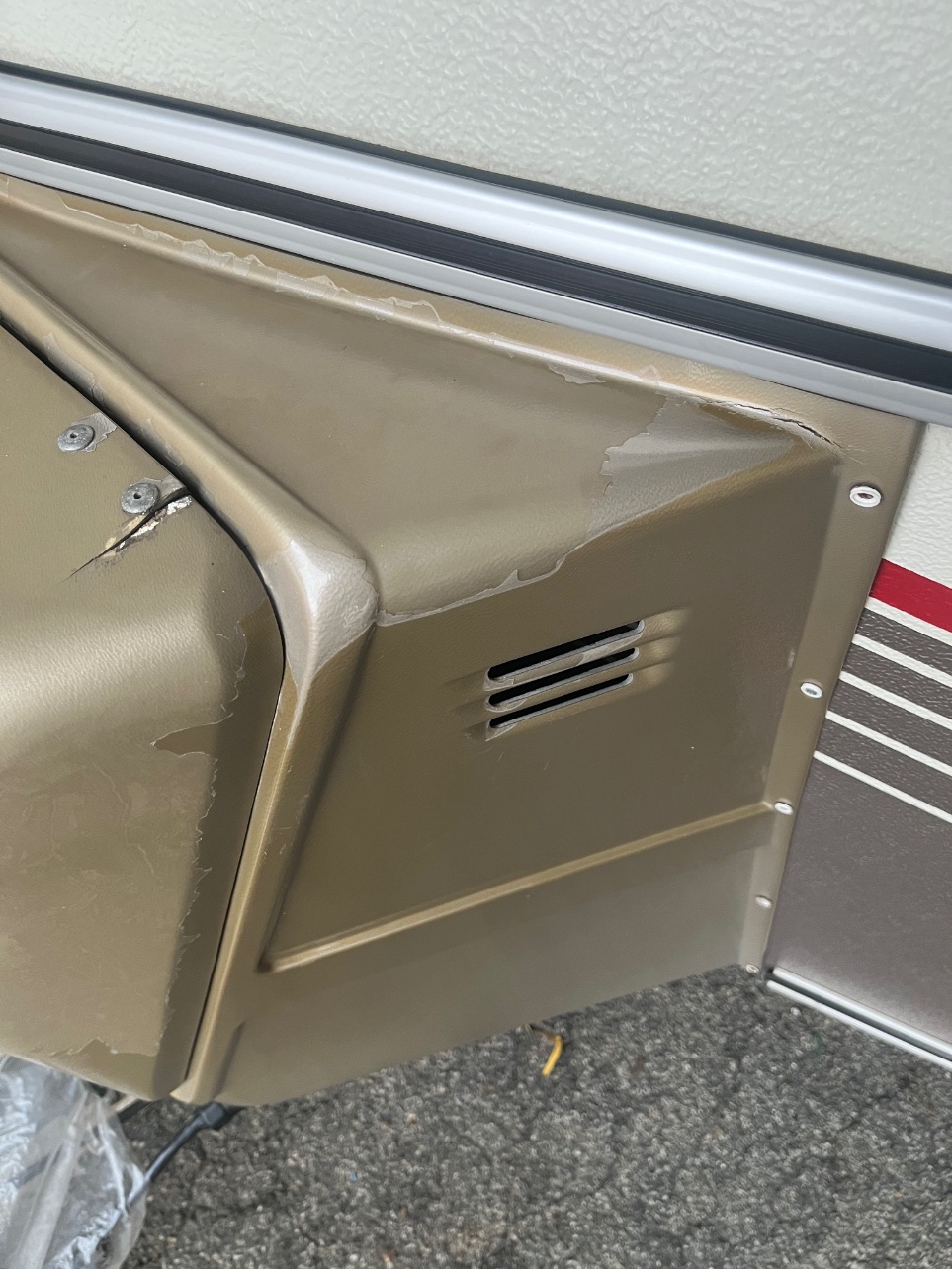 - refaire le coffre à gaz, il est cassé à quelques endroits. J’envisage d’appliquer de la résine + fibre et peut-être le repeindre. D’origine il est gris ?