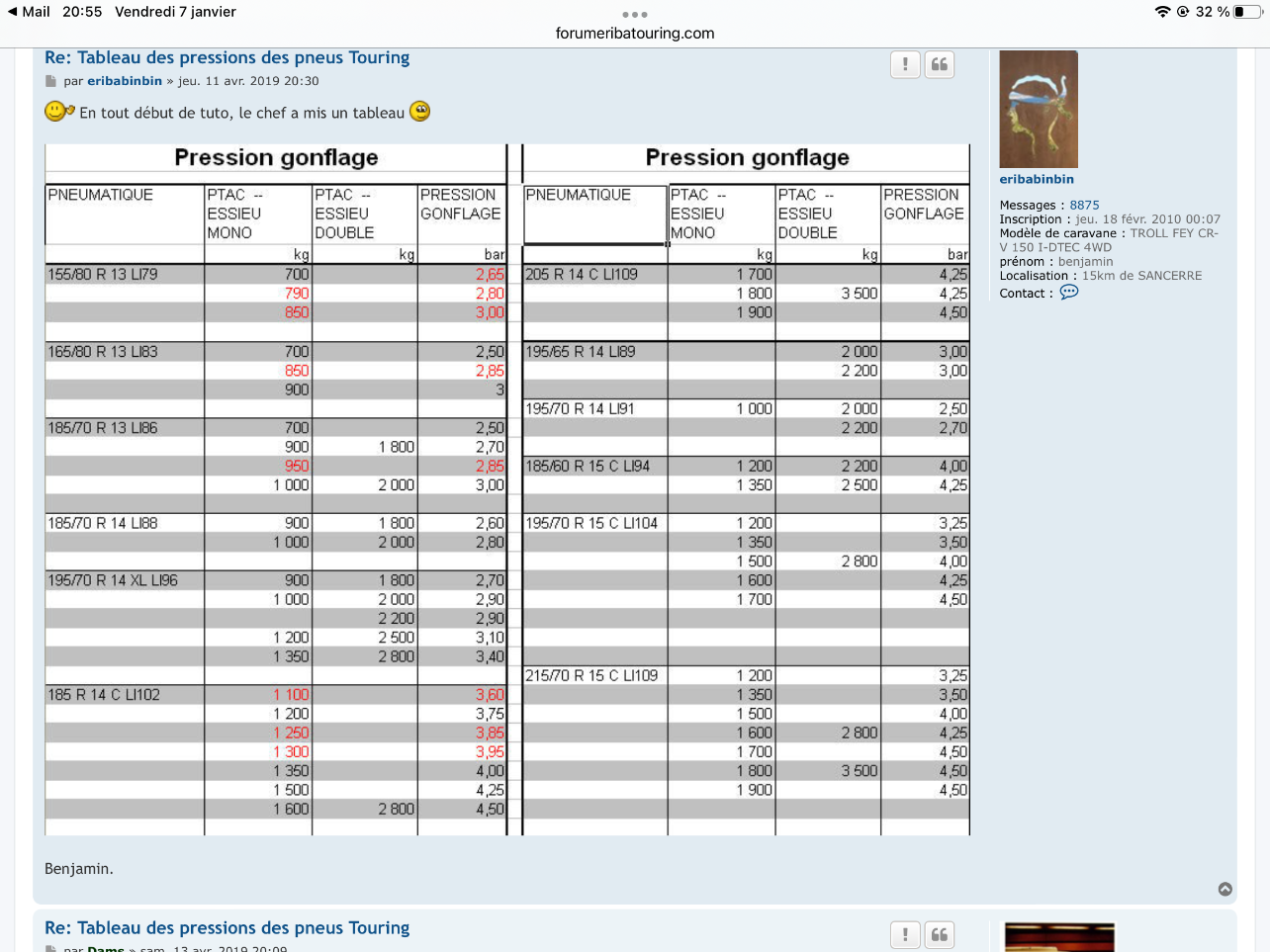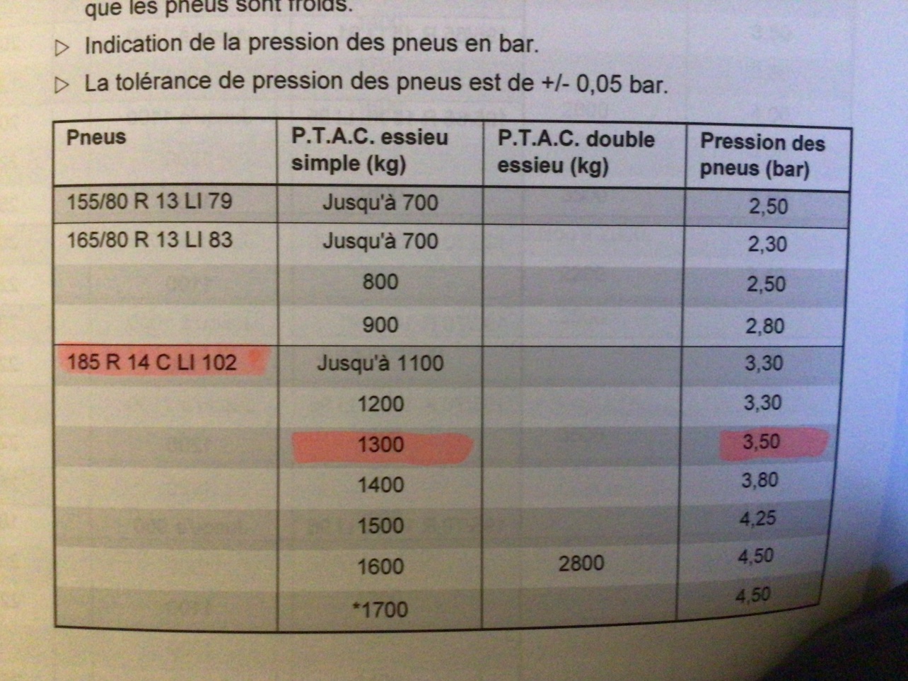 Bonjour . pour ma troll de 2009 , le tableau est dans le coffre à gaz . Pour un essieu 1200 kg et pneus en C . 3.75 bars