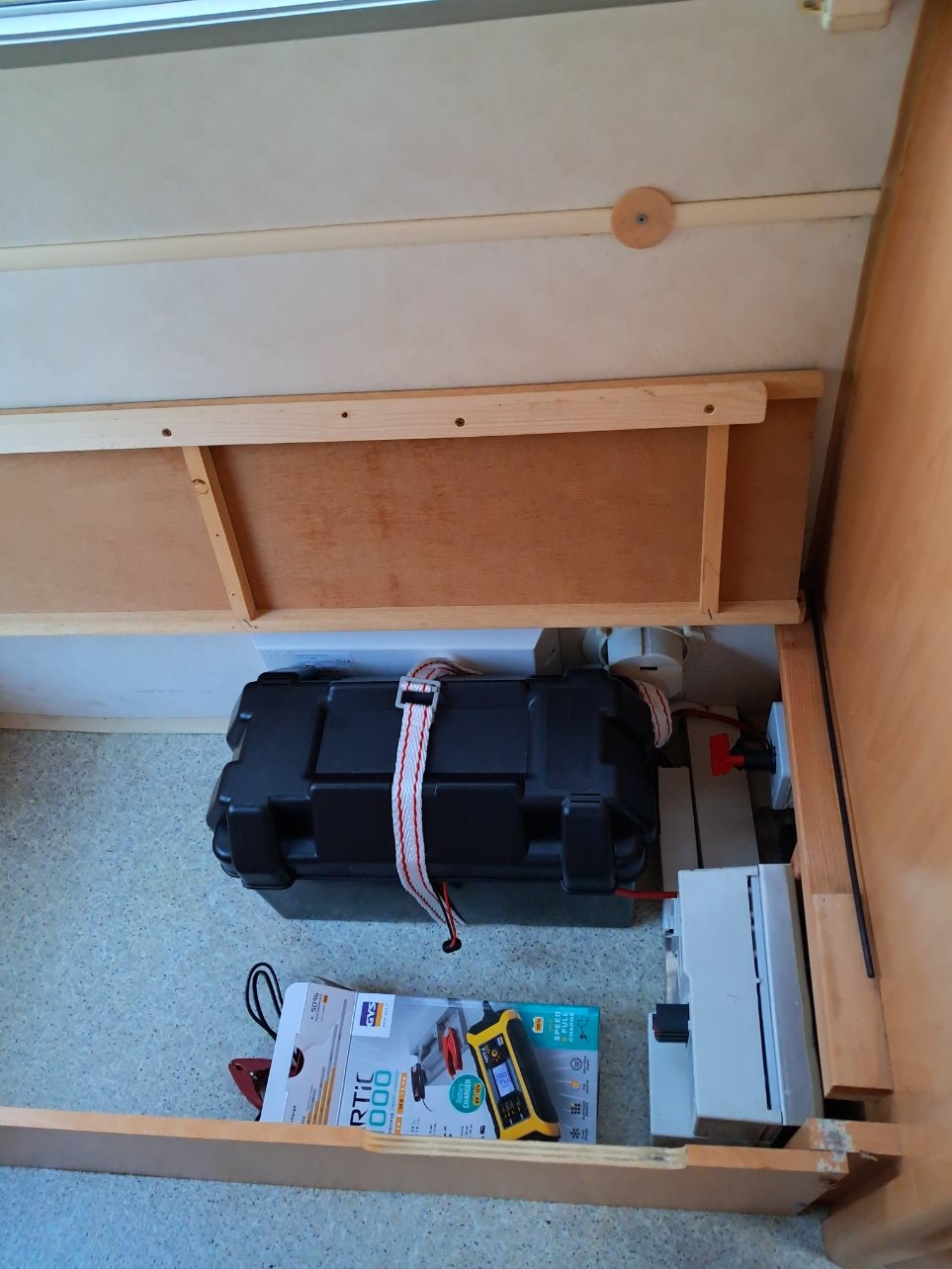 La batterie sera dans le coffre sous la penderie derrière le chauffage .