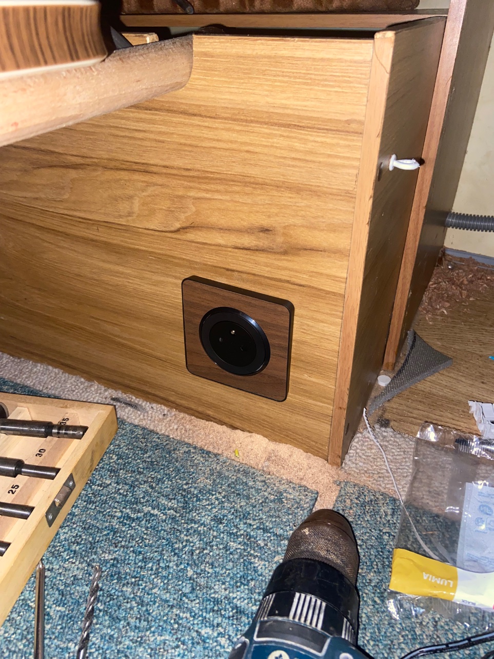Perso fait quelques modifications : remplacement de la penderie par des étagères, modification de la rallonge pour les pieds, suppression de la plaque sous la penderie pour mettre un toilette sèche fait maison. J'ai fait en sorte de pouvoir remettre tout tel que c'était (à l'exception des trous des vis pour les étagères
