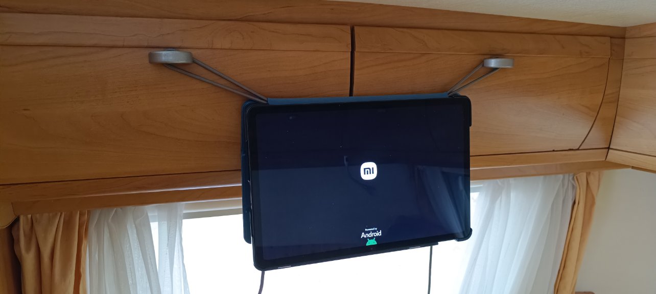 Quelques essais pour fixer notre tablette 12" pour regarder la télé au lit.
