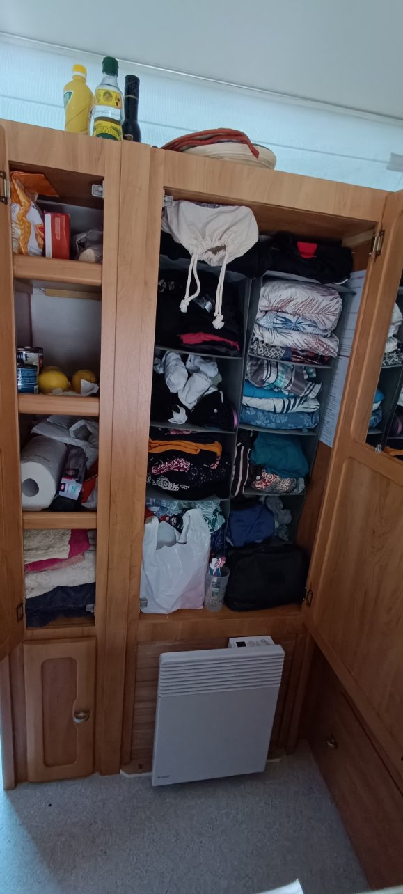 L'ancien propriétaire a remplacé le chauffage au gaz par un radiateur électrique. Comme on n'a pas de cabinet de toilette et pas trop d'envies de camping sauvage, ça nous convient très bien d'aller de camping en camping.