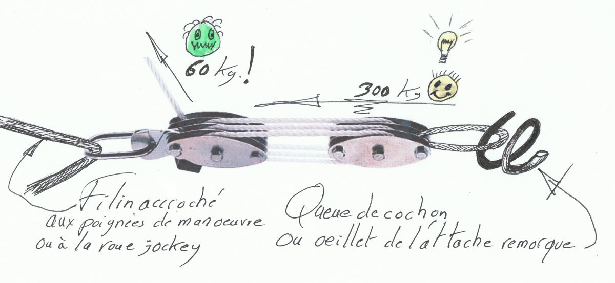 moi je m'approche le plus près possible, ensuite je passe une sangle à cliquet autour de la boule et l'autre extrémité je l'accroche sur la flèche de la