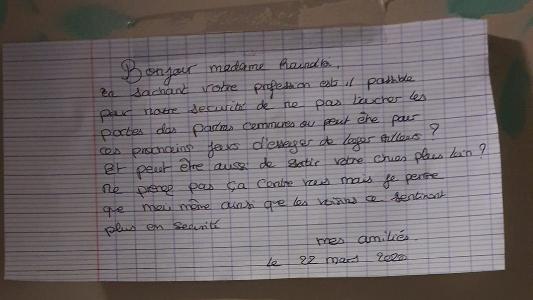 Une aide soignante de Toulouse a eu la surprise de trouver ce billet sur sa porte : Charmante attention d'un voisinage un tantinet égoïste