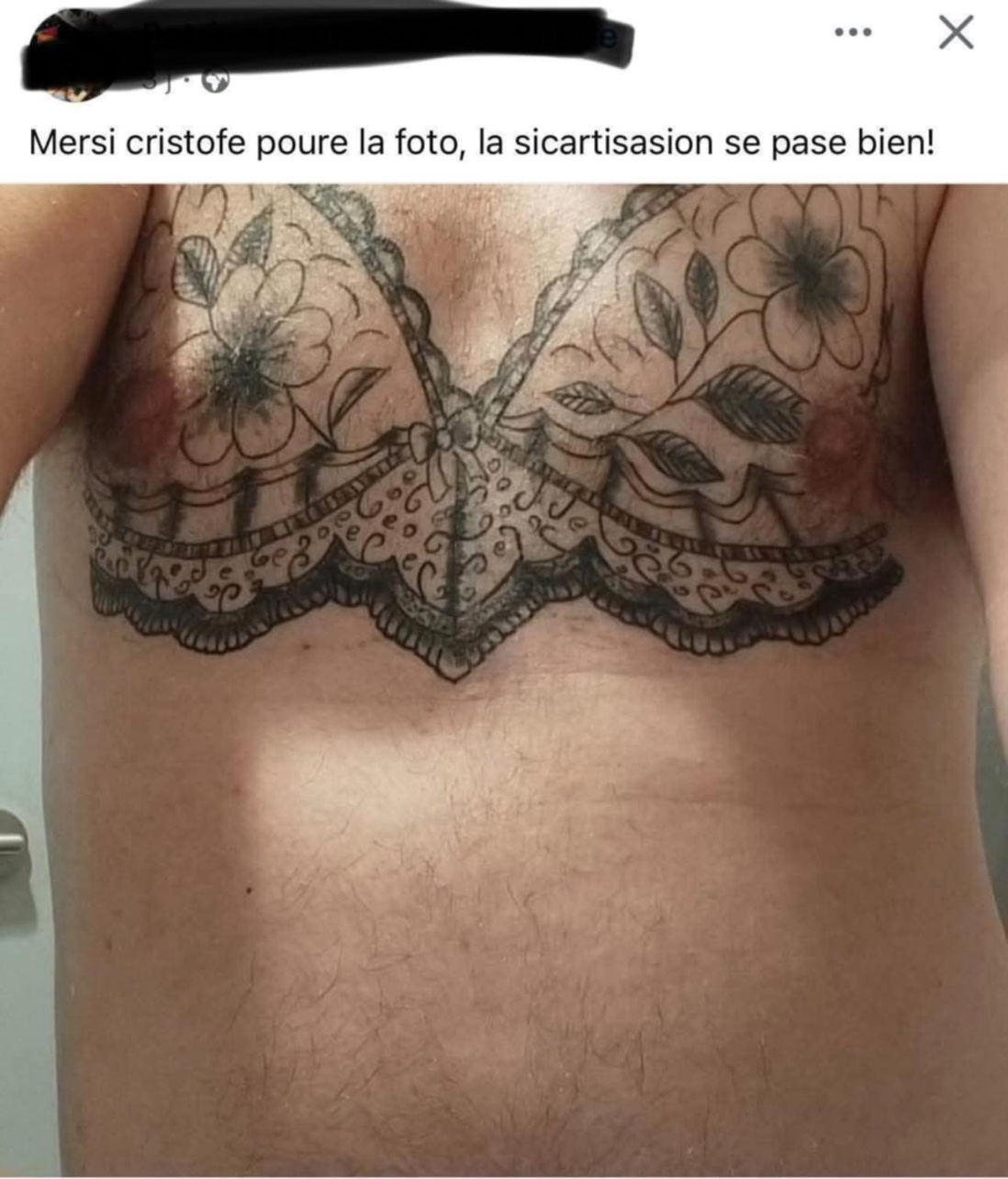 La jeune fille suivante s’avance alors et le médecin s’aperçoit qu’elle a aussi la poitrine imprimée, mais c’est cette fois un grand « M ».