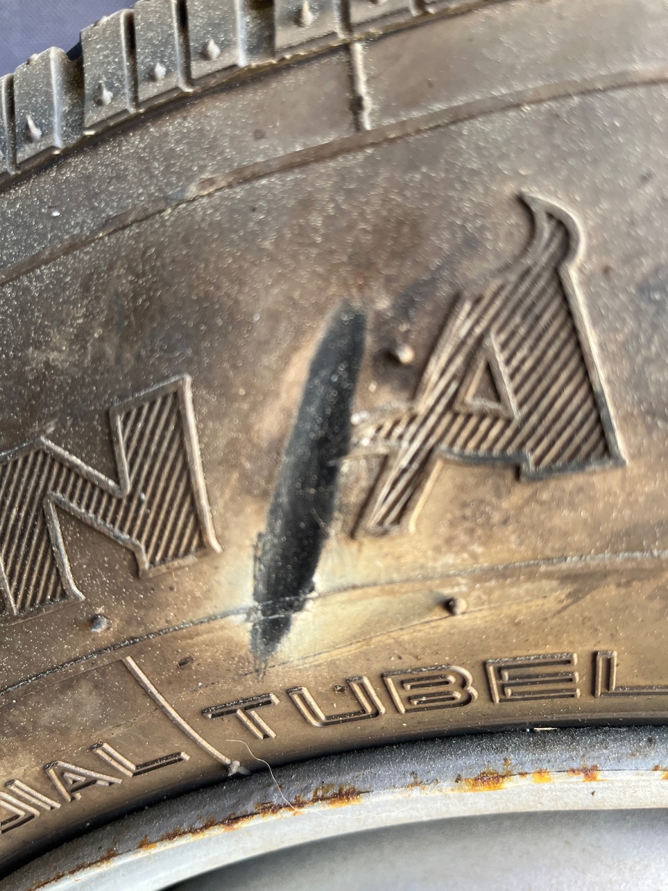 En prenant la roue de secours, j’ai remarqué de belles entailles sur le flanc du pneu.
