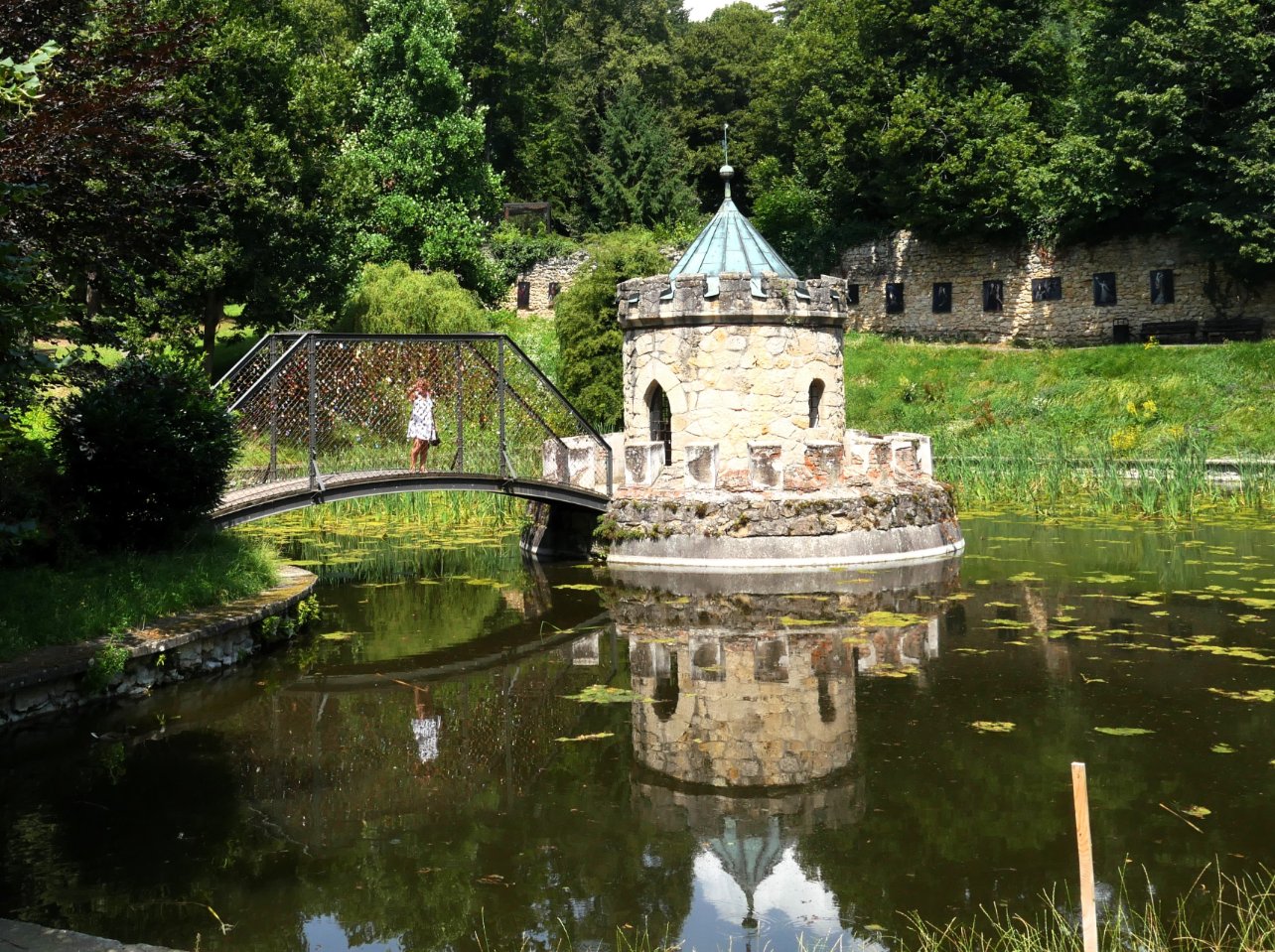 14 juillet nous changeons de camping un peu + au nord un peu + en altitude en espérant avoir un peu - chaud, toujours 30° mais un emplacement + ombragé, aujourd'hui un petit tour pour quelques courses et petite promenade autour d'un étang à côté d'un Château Hôtel, avec une petite chapelle sur un rocher ! et une croix gothique miniature.