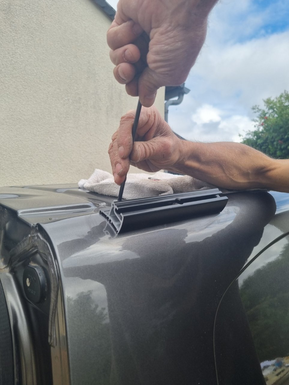 Pour le retour Elisa et moi, nous trouvons la solution, le store sera introduit par la baie AR, reposera sur le lit et viendra se loger comme un grand à la base de la porte, essai de vérification, il est en travers et bien coincé il ne bouge pas, ouf ouf.