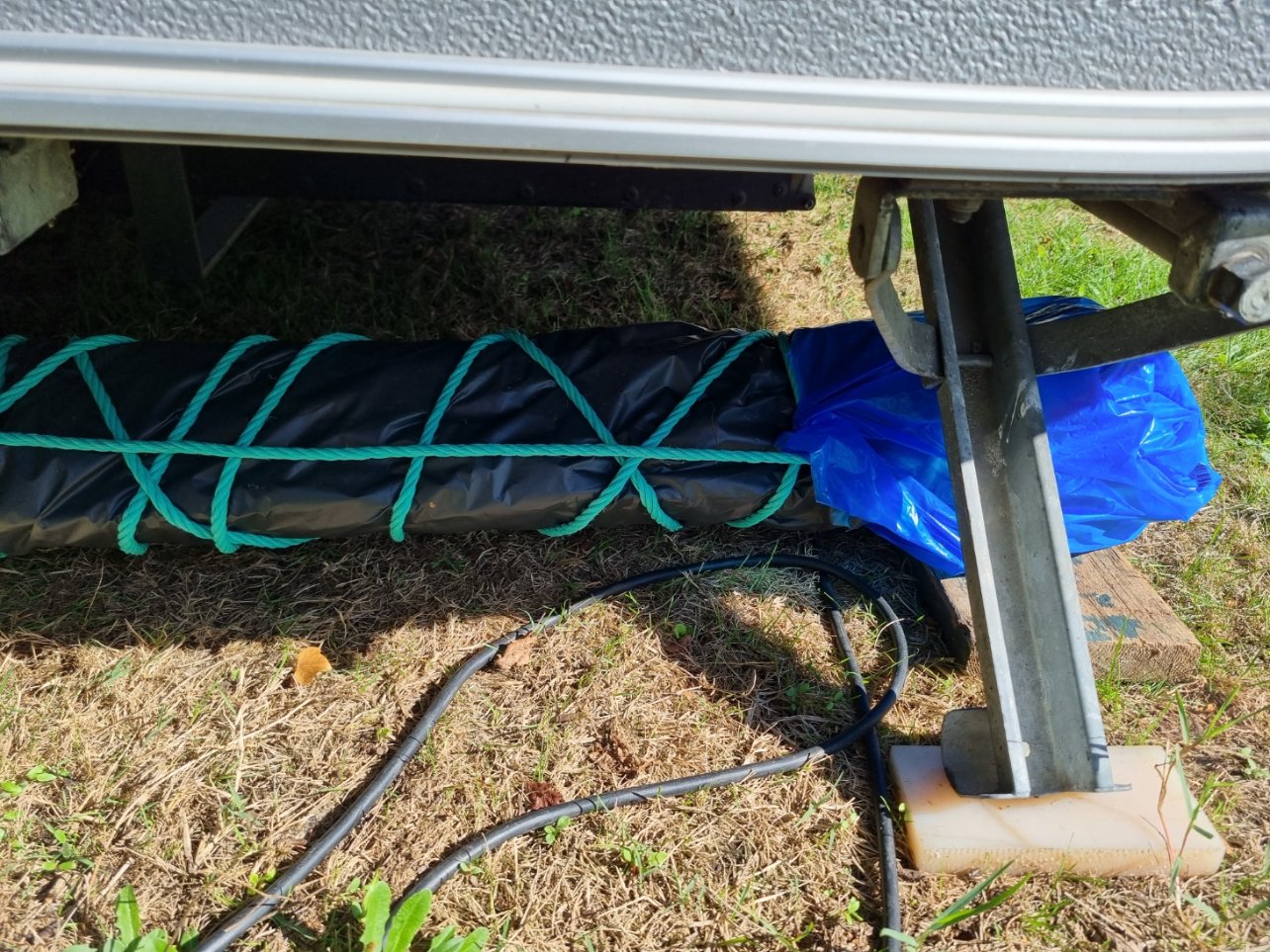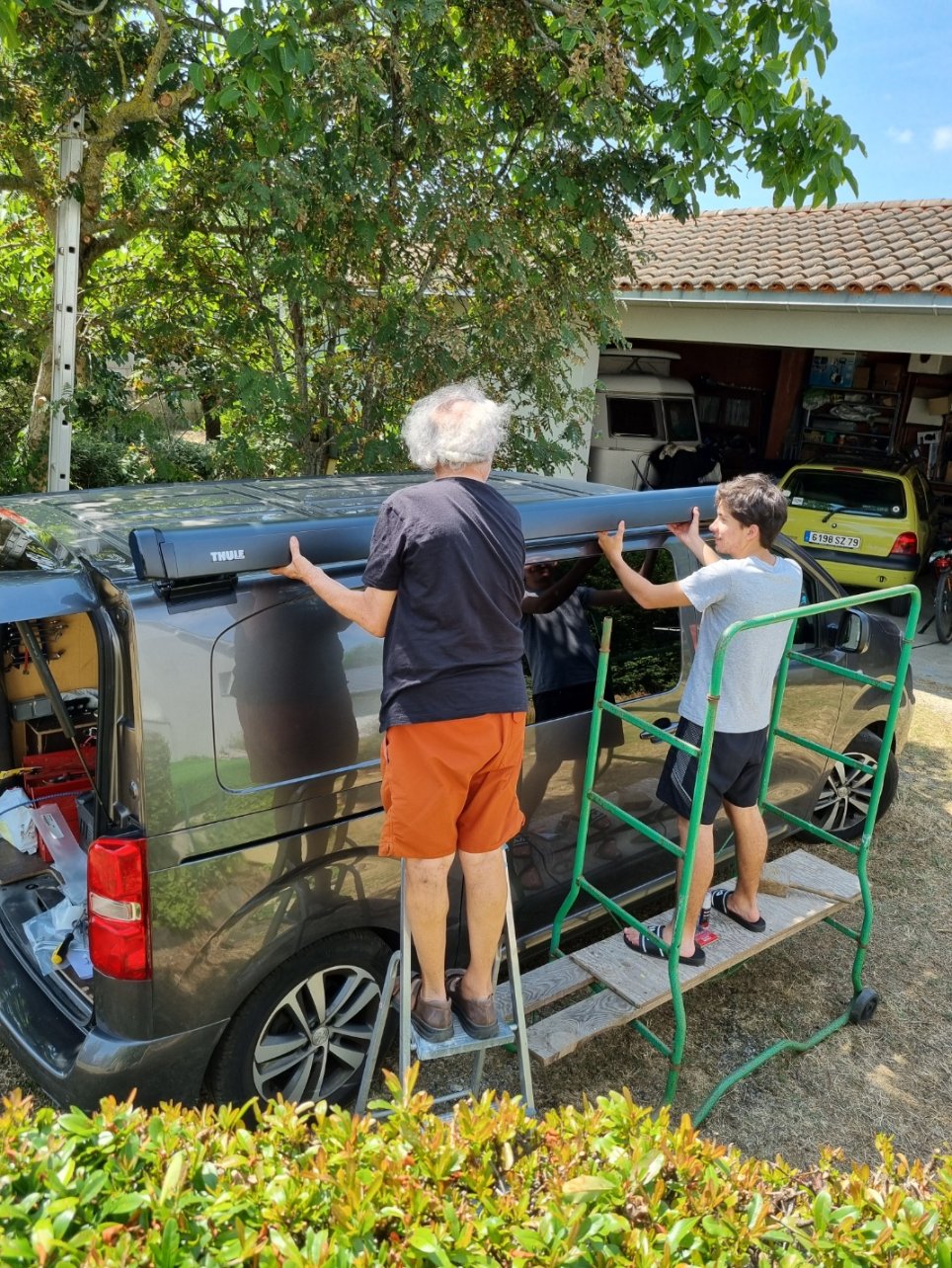 Nous démontons le store, ils sont optimistes, ils évaluent que juste le 2 pièces double liaison des bras de déploiement sont cassées. Une fois à terre le store n'est pas voilé, nous l'emmaillotons correctement et oups glissé bien à l'abri sous El Riba.
