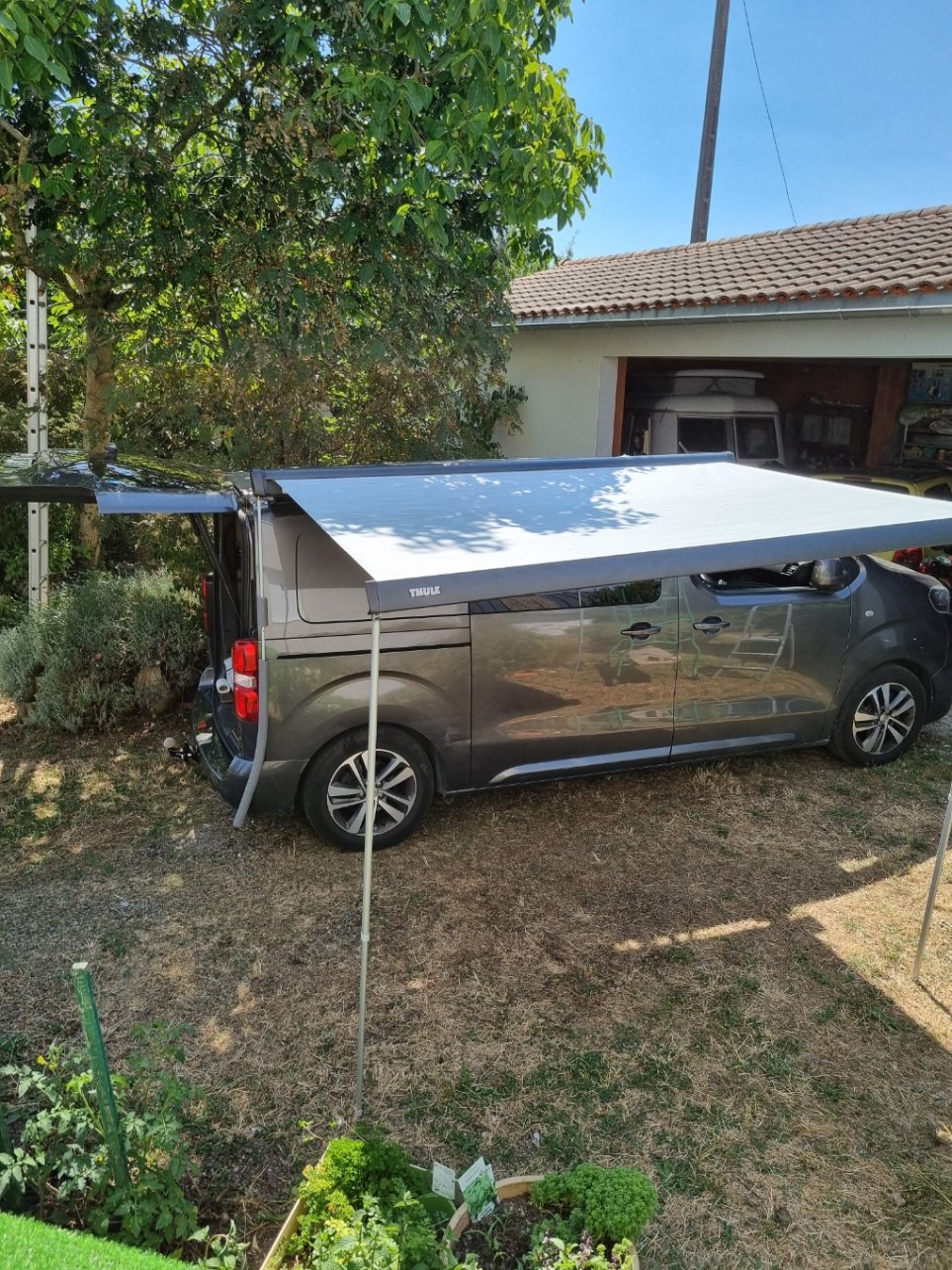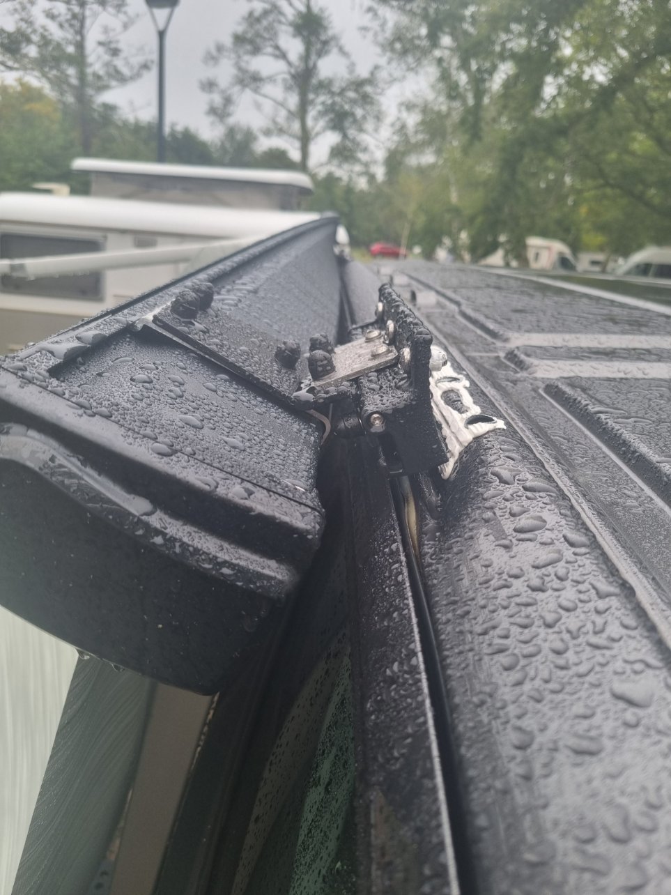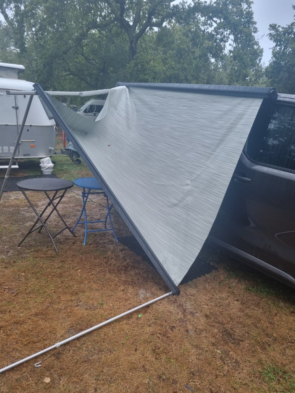 Bah voila, 1 ère nuit le jf fatigué se couche tôt et oublie de régler une inclinaison prononcée du store, durant la nuit gros déluge, 2h00 du mat toujours pluie torrentielle, le jf se réveille inquiet entrouvre la porte braque sa torche et l'horreur, une énorme poche d'eau s'est formée, in-remuable, j'essaie de basculer un pied mais trop rapidement une grosse vague se forme, un craquement sinistre très bref le store s'est arraché du toit