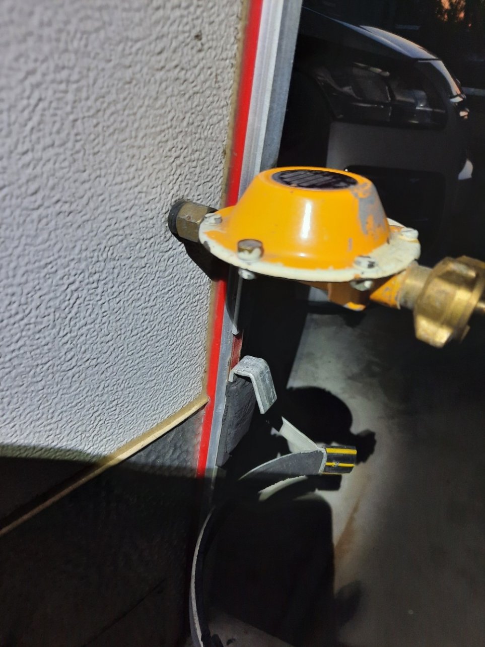 Au vu de l'emplacement de l'embout d'entrée gaz, je me demande s'il n'y aurait pas moyen de trouver un coude male - femelle, et de visser directement le détendeur dessus, et de fixer le détendeur sur la barre verticale, ça éviterait de percer la tôle de la caravane et surtout, il semble que l'assise verticale est plus solide, en plus à cet endroit, la forme de la caravane est triangulaire, ce qui complique la fixation. Avec des cales, on doit pouvoir ajuster cela. Vous en pensez quoi ?