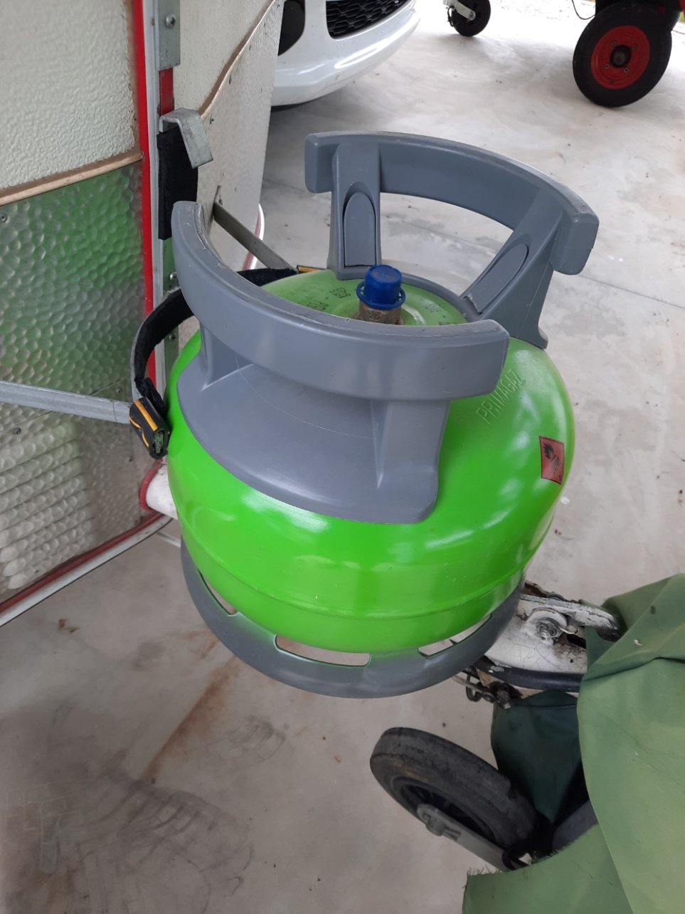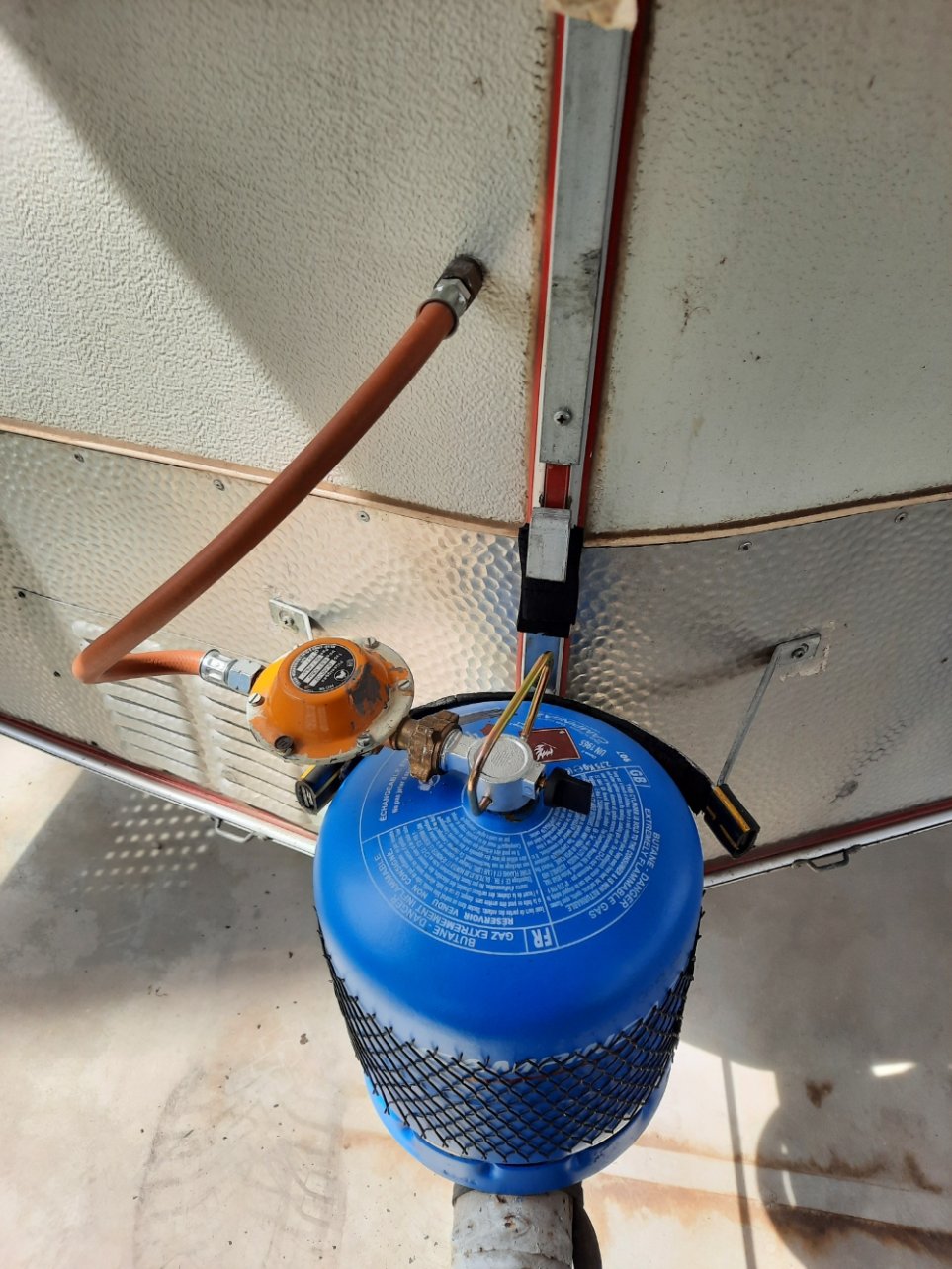Le soldat Bruno a tout dit! Et le capitaine Land aussi. Par contre, une plaque( qui devait exister au départ) sur le timon supporte la bouteille. Elle est fixée par deux demi-brides sous le timon et habillée par le coffre. À l'intérieur la robinetterie semble nickel, mais avec des éléments rapportés. La Twiny ne pose pas de soucis puisqu'avant c'était des 13kg. Par contre dans le coffre à gaz, hormis un branchement par vissage olive, pas de détendeur avec la tuyauterie pour brancher la bouteille.