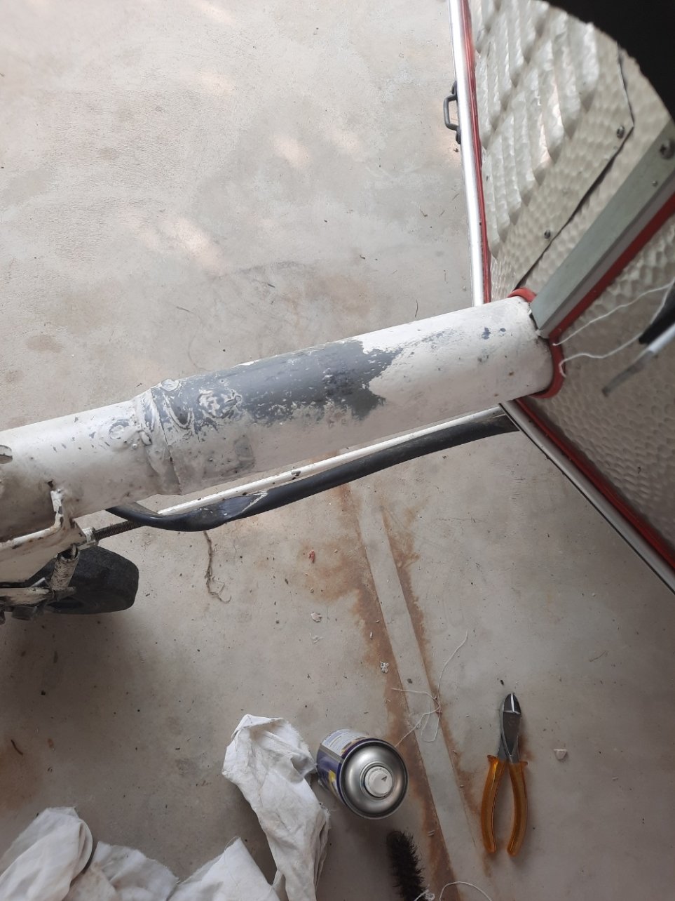 J'ai trouvé que le timon était moche et des points de rouille ... du coup peinture ... (seulement la partie sous le coffre à gaz ; sinon, je vais devoir partir en septembre en vacances