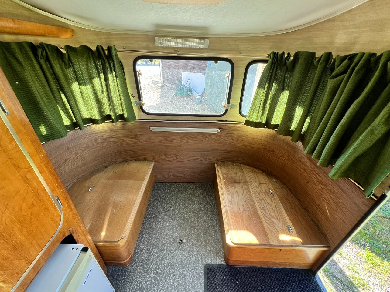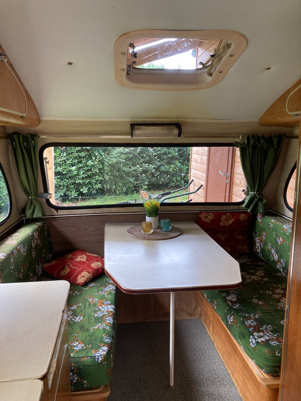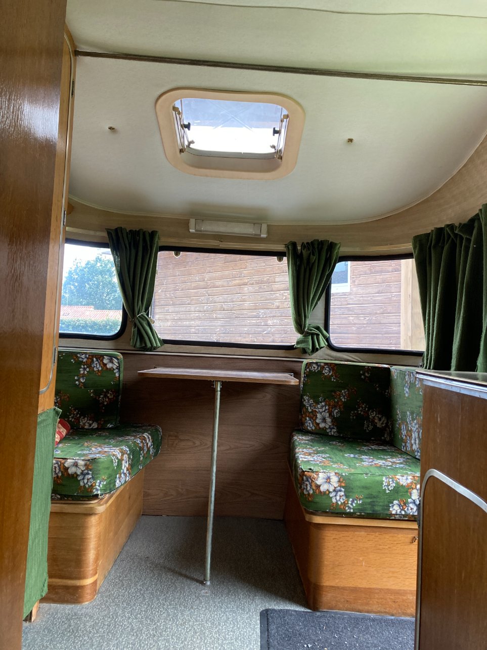 Je vous montre donc les photos, à part la couleur verte à l'extérieur elle est toute d'origine, tissu de coussins, sol...