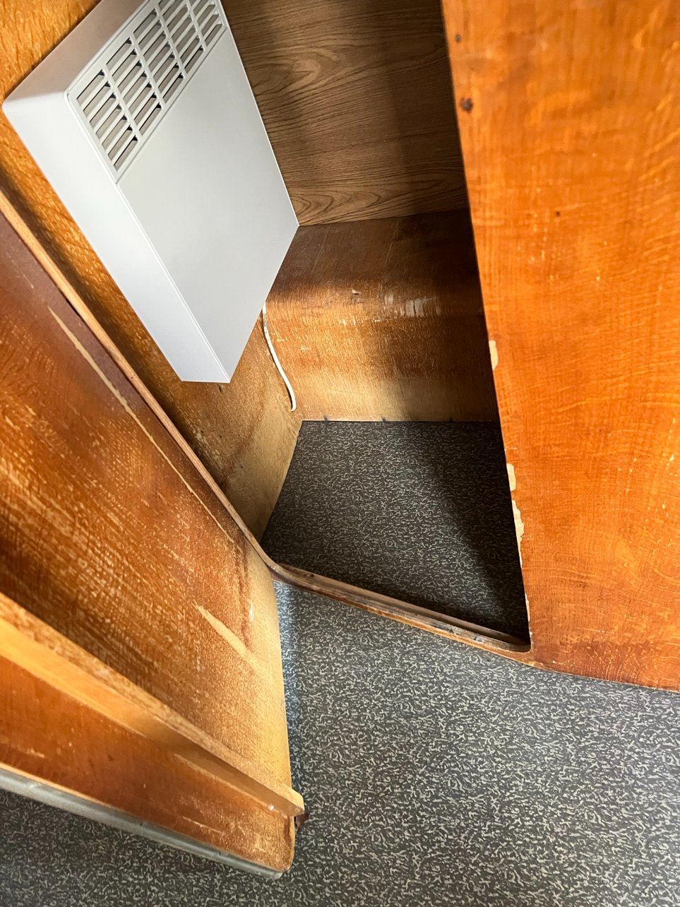 - Les meubles en bois sont fatigués, je compte les laisser bois mais il faut poncer le vieux vernis, faire quelques réparations, remettre une couche de vernis.